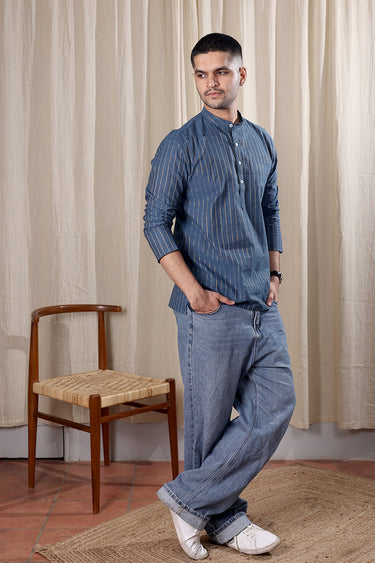 8. Denim Blue Zari Stripes South Cotton Men Short Kurta