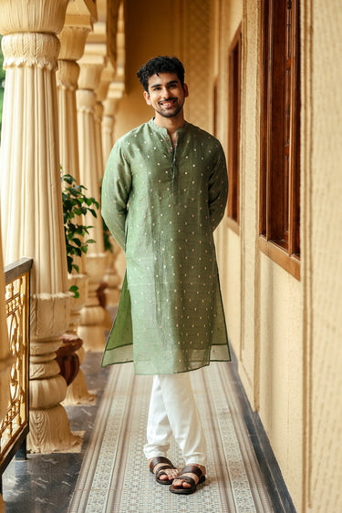 1. Green Jaquard Stripe Banarasi Silk Men Long Kurta