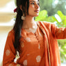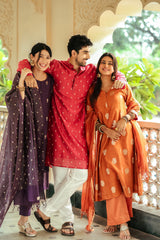 Crafted in lustrous Banarasi silk, this kurta glows in a rich burnt orange hue—radiating warmth with every movement. Jacquard buta motifs bloom in delicate floral forms, adding quiet depth. Tailored in an A-line silhouette with a soft cotton lining. Pair it with our coordinated bottom and dupatta for a festive look that feels rooted.