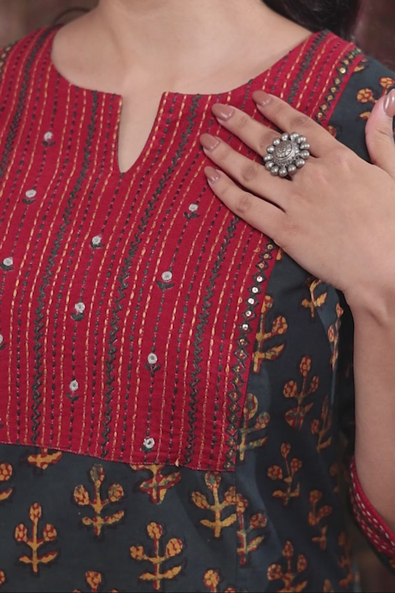 Green Hand Embroidery Dhabu Cotton Women Long Kurta Long Sleeves WLKLS252C147