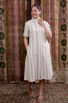 Blue Grey Sanganeri Cotton Linen Women Midi Dress Short Sleeves WDRSS253C8