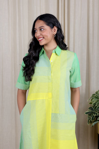 Citrus Green Stripe Panel South Cotton Women Midi Dress Long Sleeves WDRLS251C2