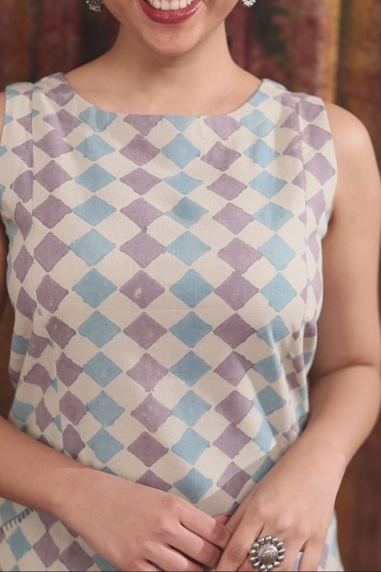 Purple Blue Sanganeri Cotton Linen Women Midi Dress Sleeveless WDRSL253C18