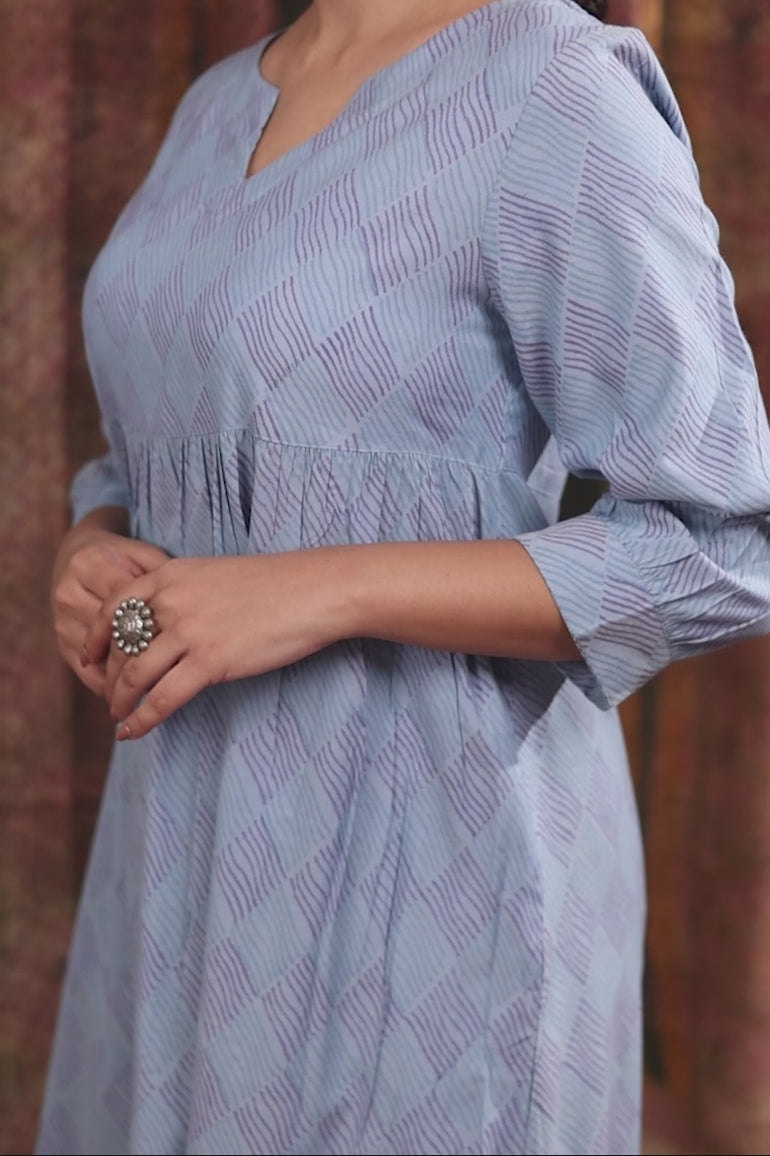 Blue Purple Sanganeri Cotton Blend Women Midi Dress Long Sleeves WDRLS253C2