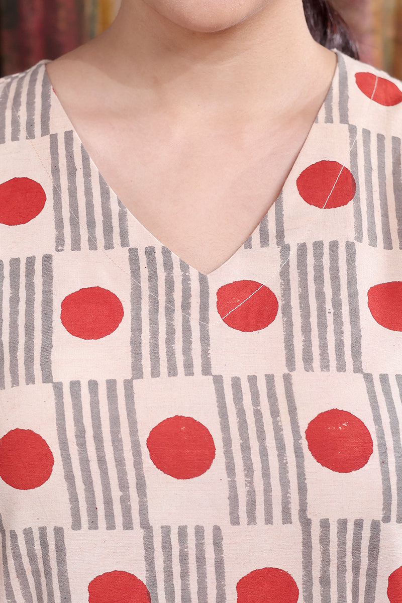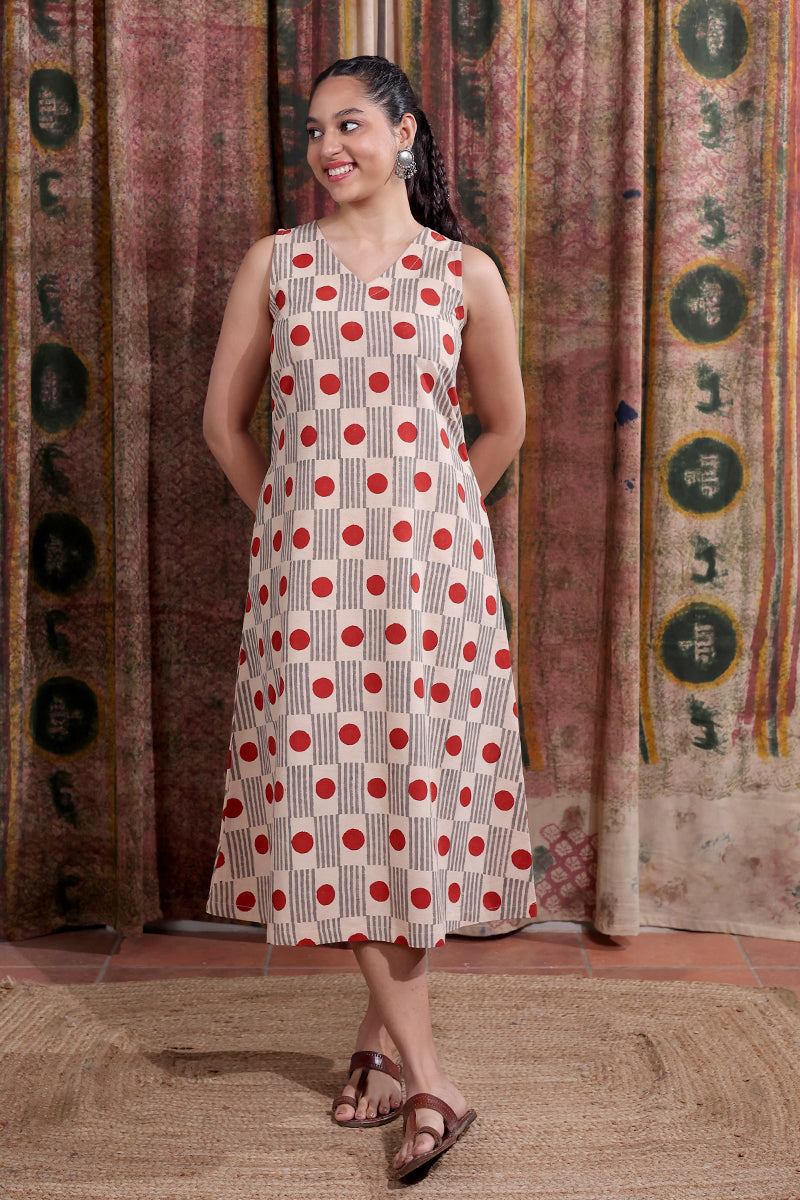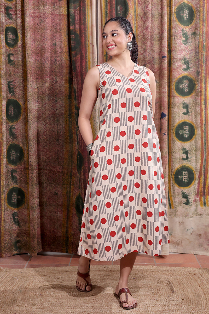This timeless cotton midi dress features a Bagru handblock print with pockets on both sides for added comfort. Perfect for a day at work or a casual outing, with style that moves with you.