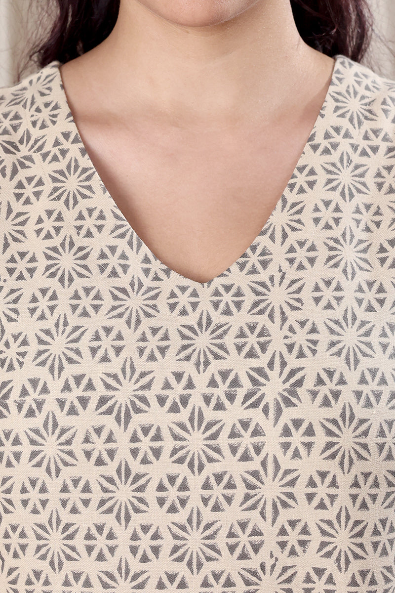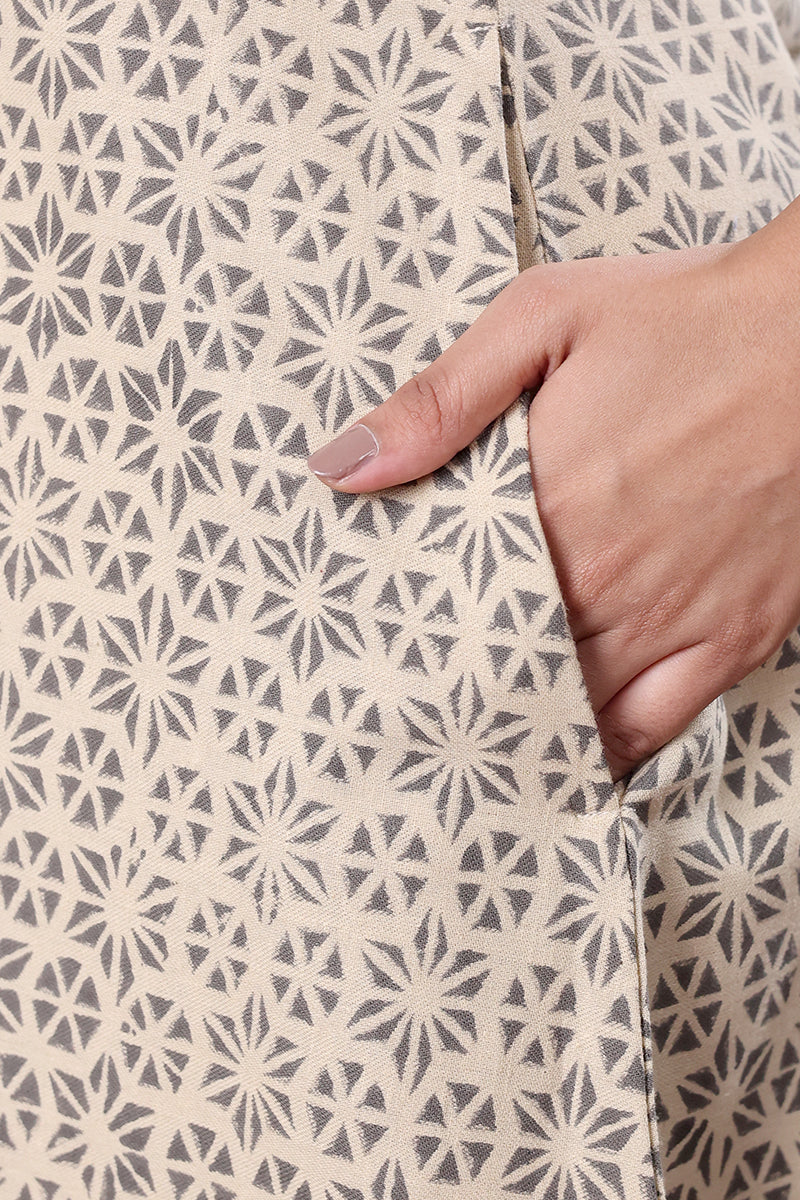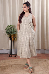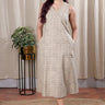 Beige Sanganeri Cotton Flax Herring Bone Women Midi Dress Sleeveless WDRSL252C3