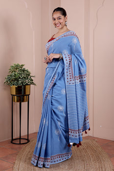 Blue Sanganeri Cotton Malmal Saree SAREE251C24