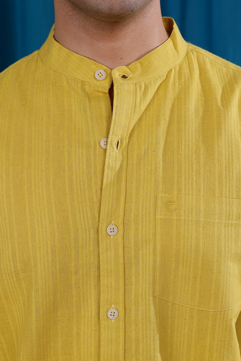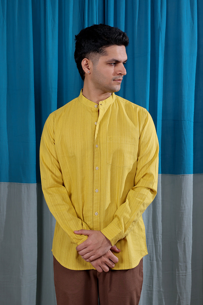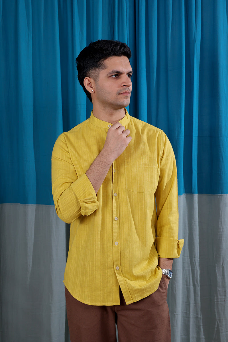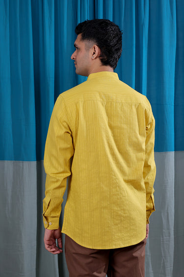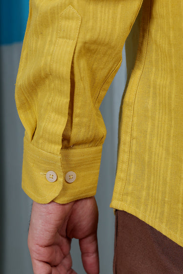Mustard Yellow Dobby Stripes Natural Cotton Linen Men Shirt Full Sleeves MSHFS12253
