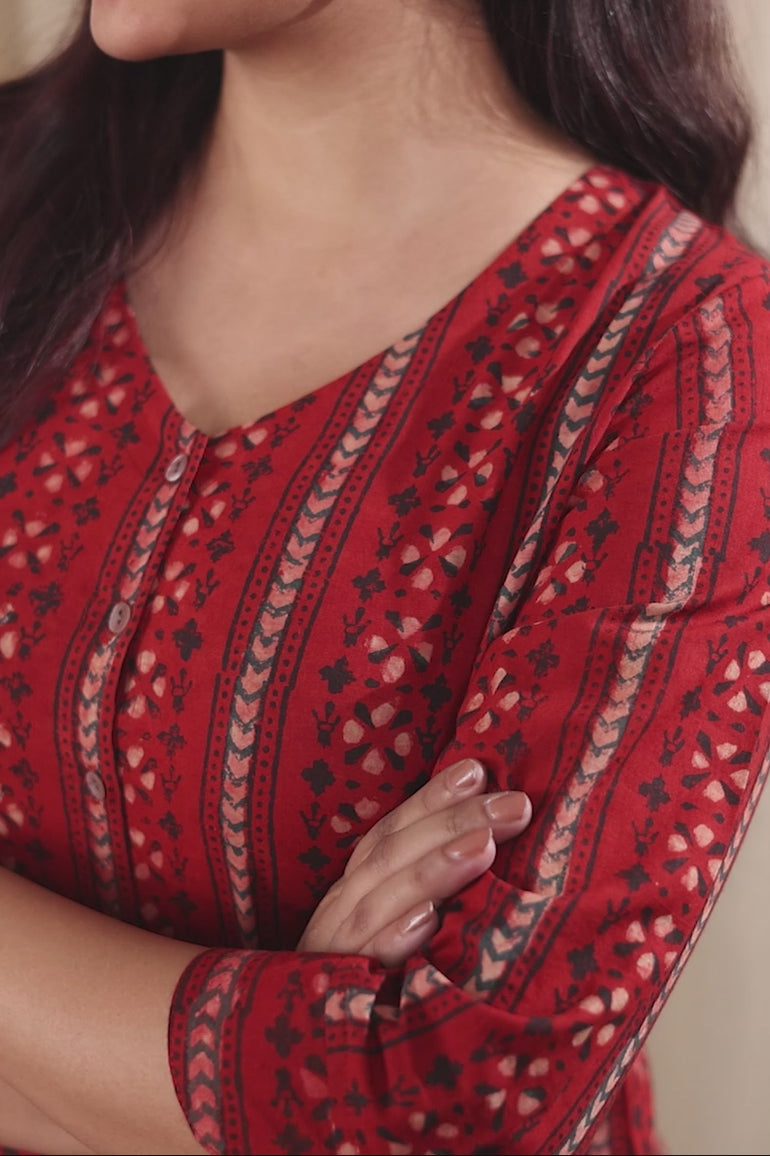 Rose Red Sanganeri Cotton Linen Women Kurti Long Sleeves WKILS253C26