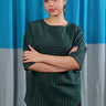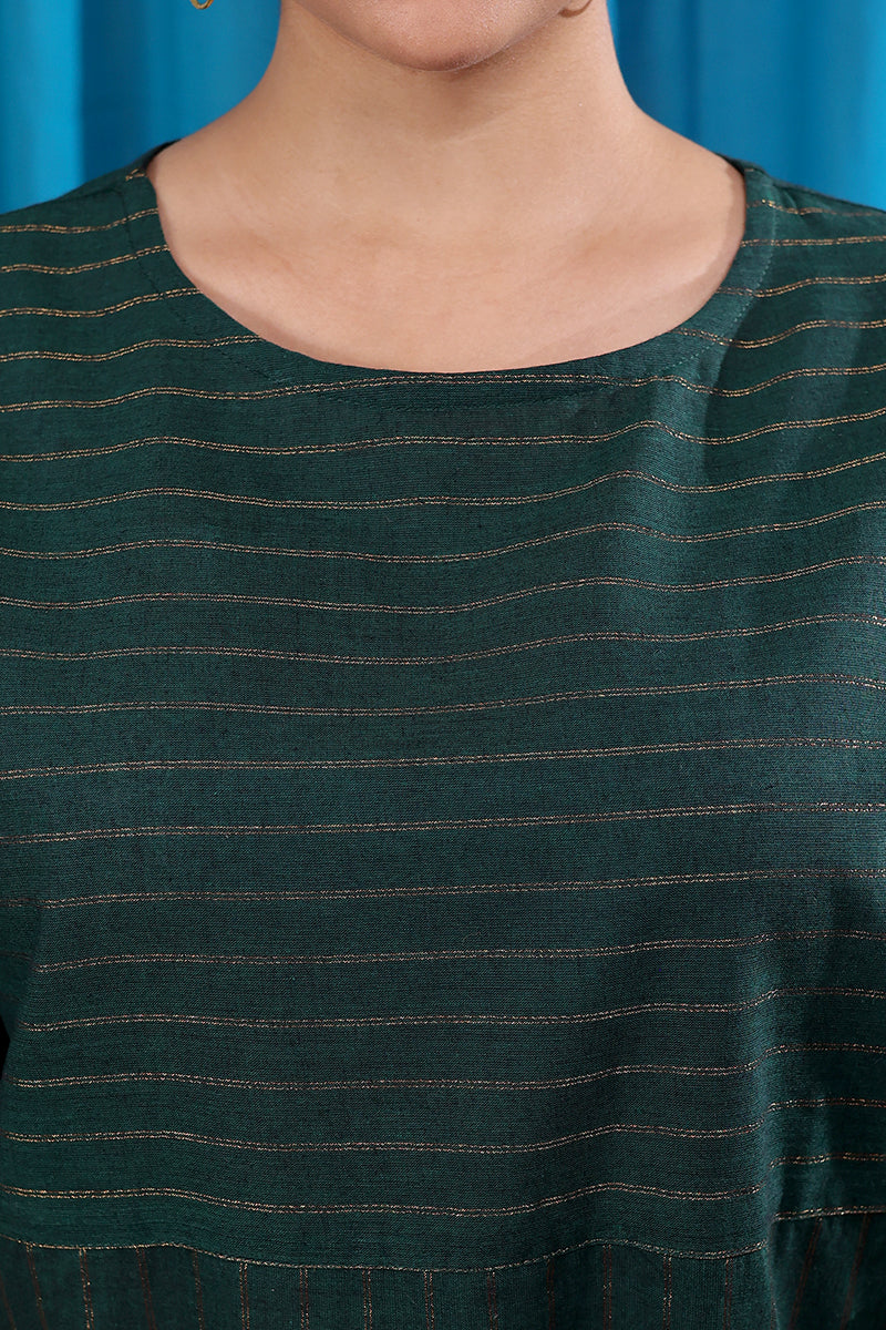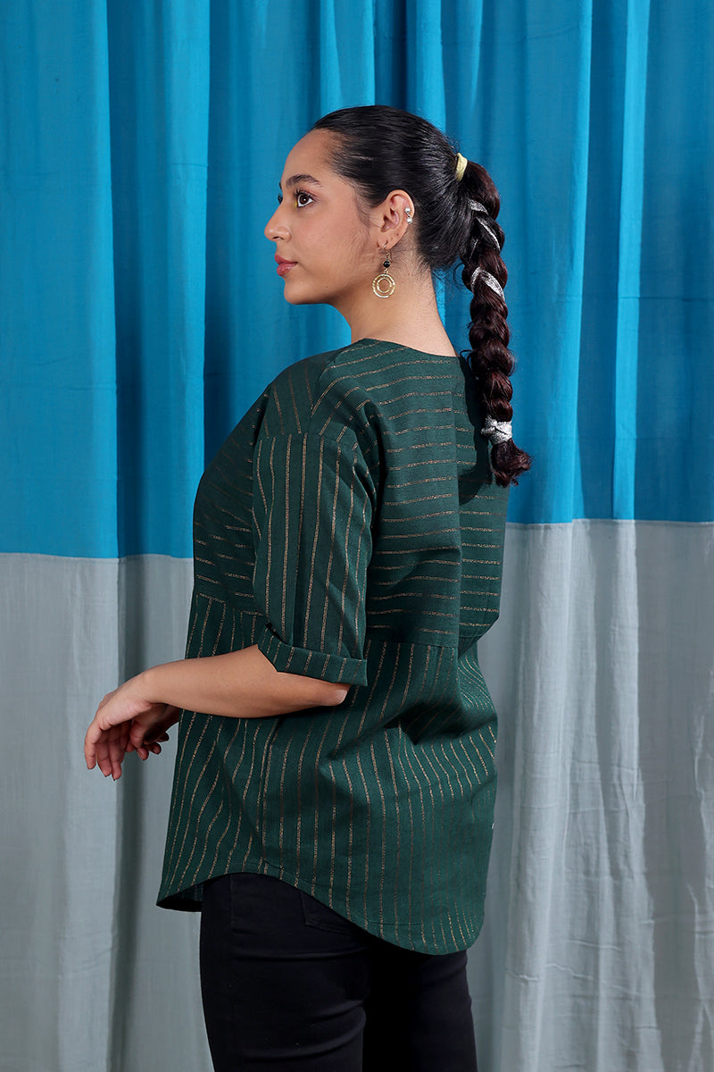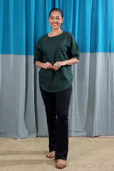 A forest green oversized kurti in south cotton with subtle zari stripes that add a quiet festive touch. Long sleeves and a roomy fit make it as comfortable as it is stylish.