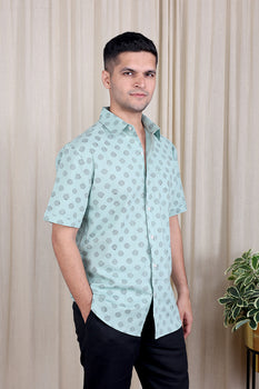 Mint Green Sanganeri Cotton Linen Men Shirt Half Sleeves MSHHS251C5