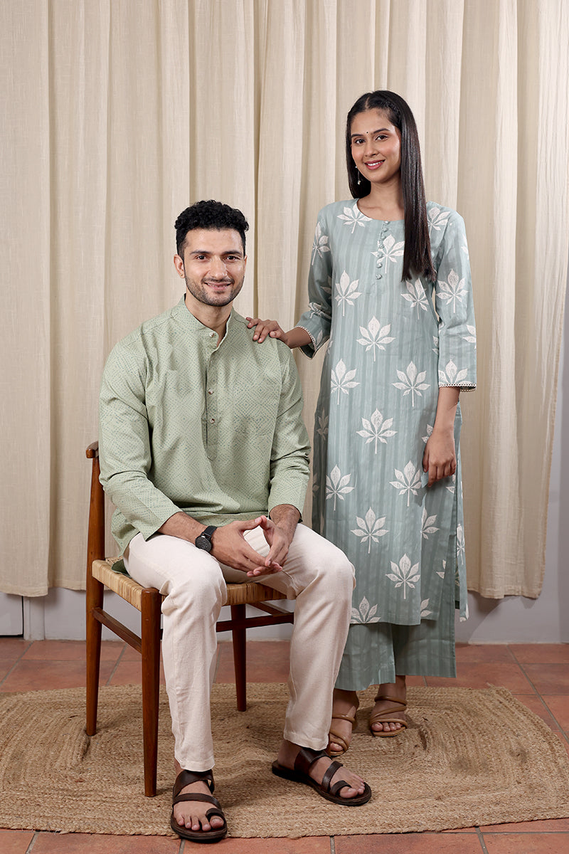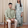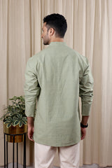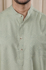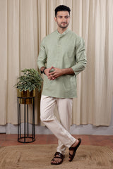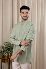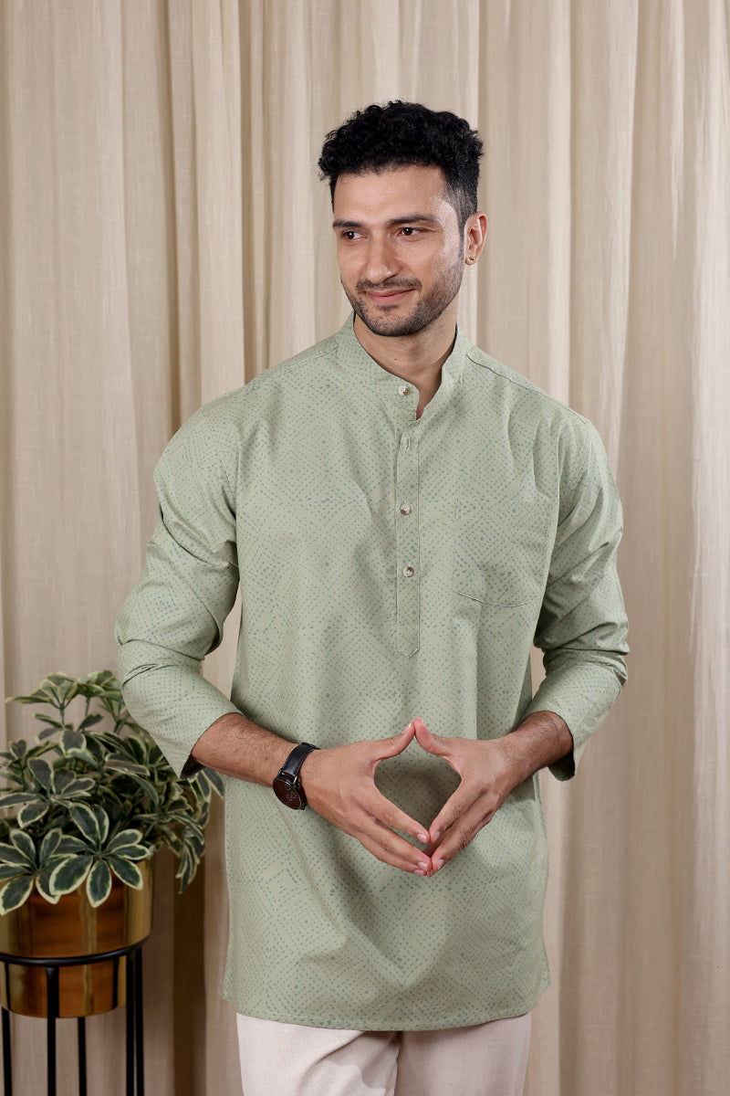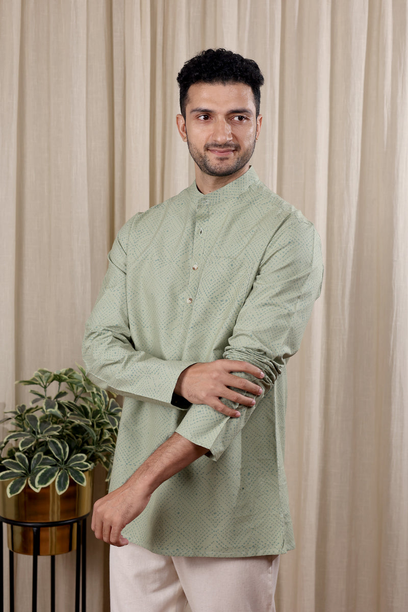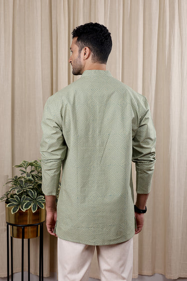 Sage Green Sanganeri Fine Cotton Men Short Kurta Full Sleeves MSKFS252C31