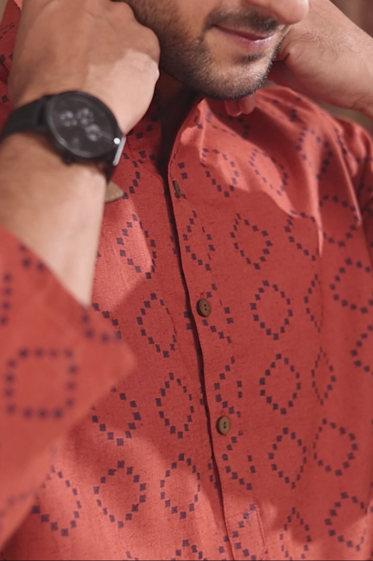 Rust Sanganeri Cotton Linen Men Long Kurta Full Sleeves MLKFS253C20