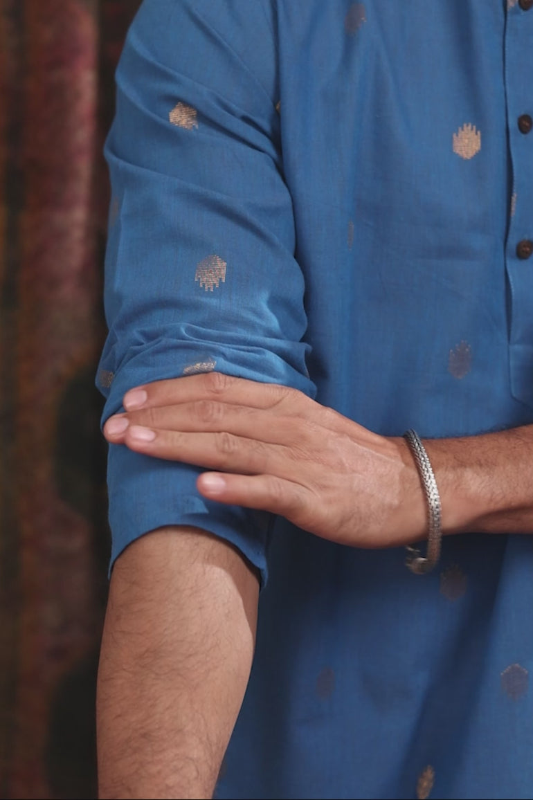 Blue Zari Buti South Cotton Men Long Kurta Full Sleeves MLKFS253C16