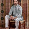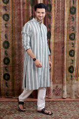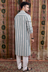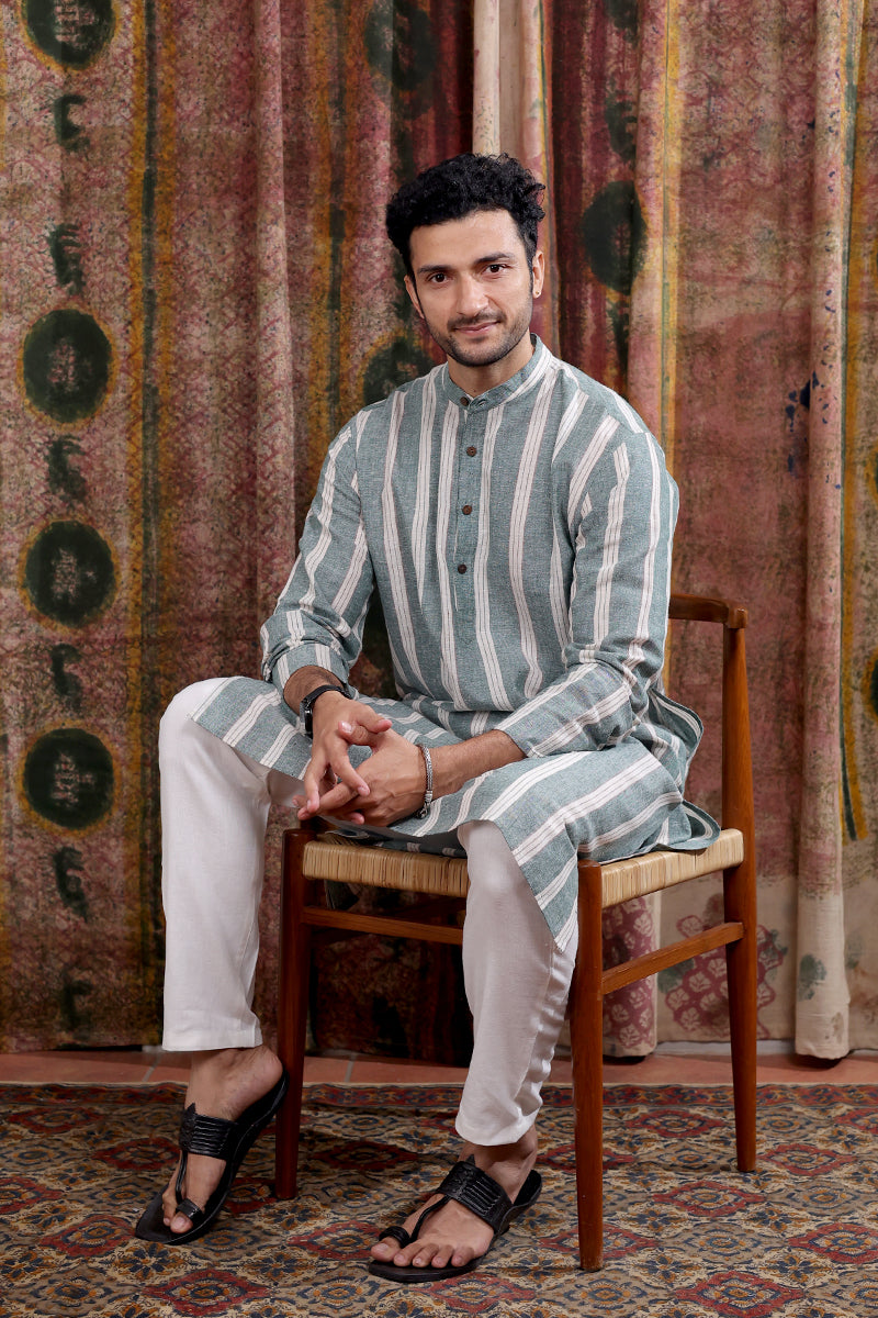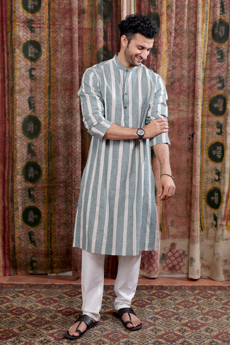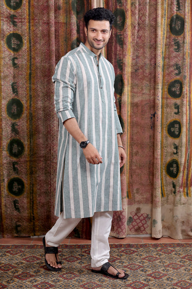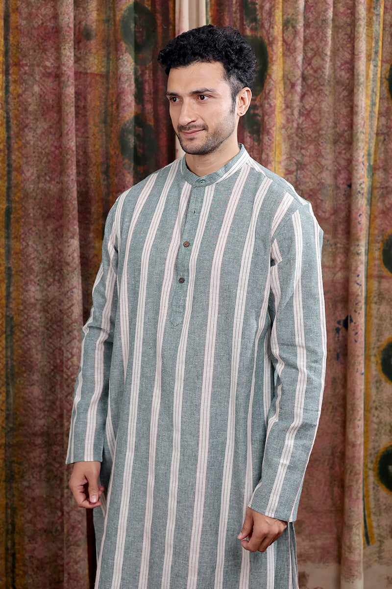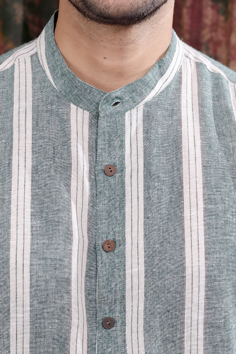 Forest Green Stripes Cotton Linen Men Long Kurta Full Sleeves MLKFS253C33