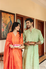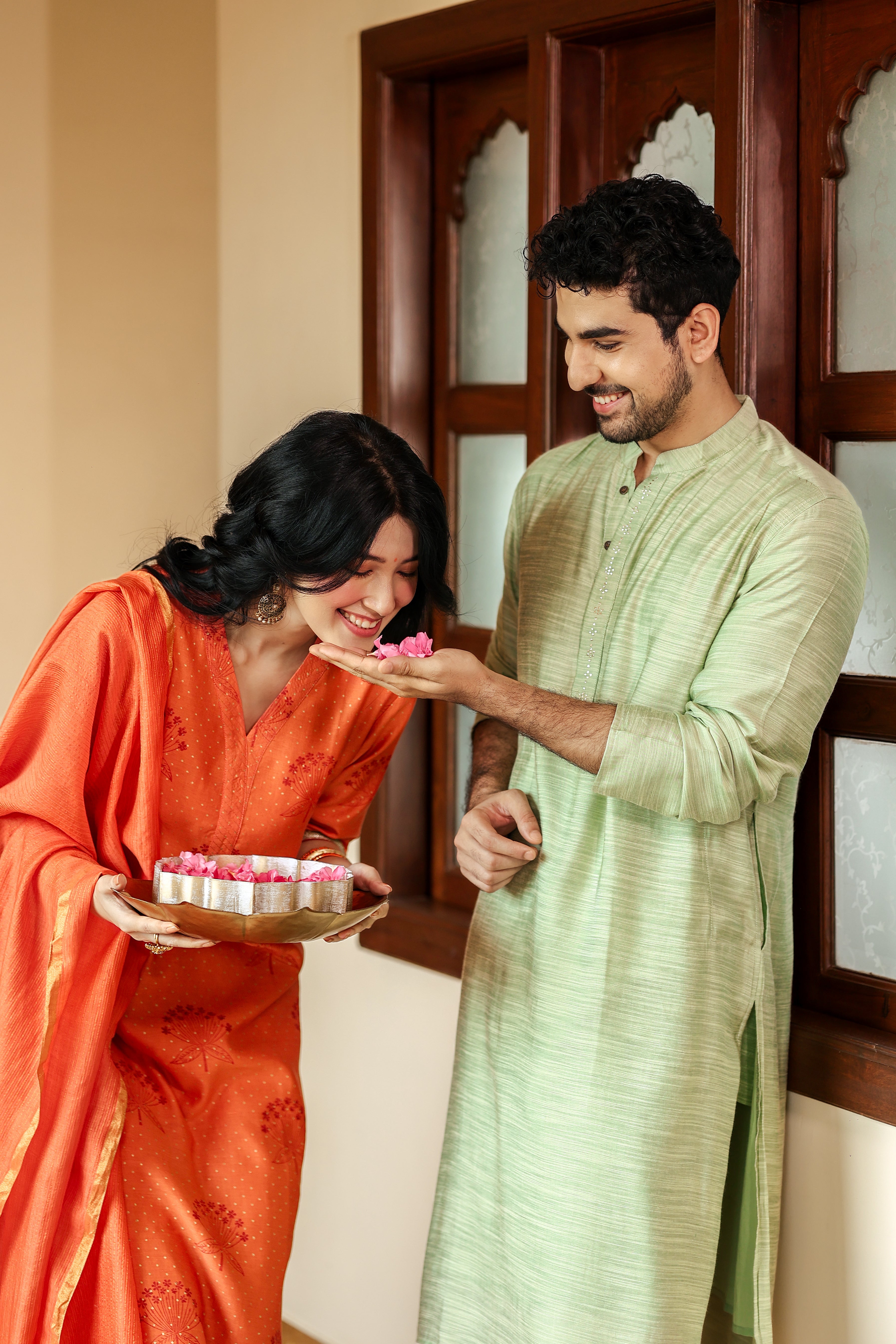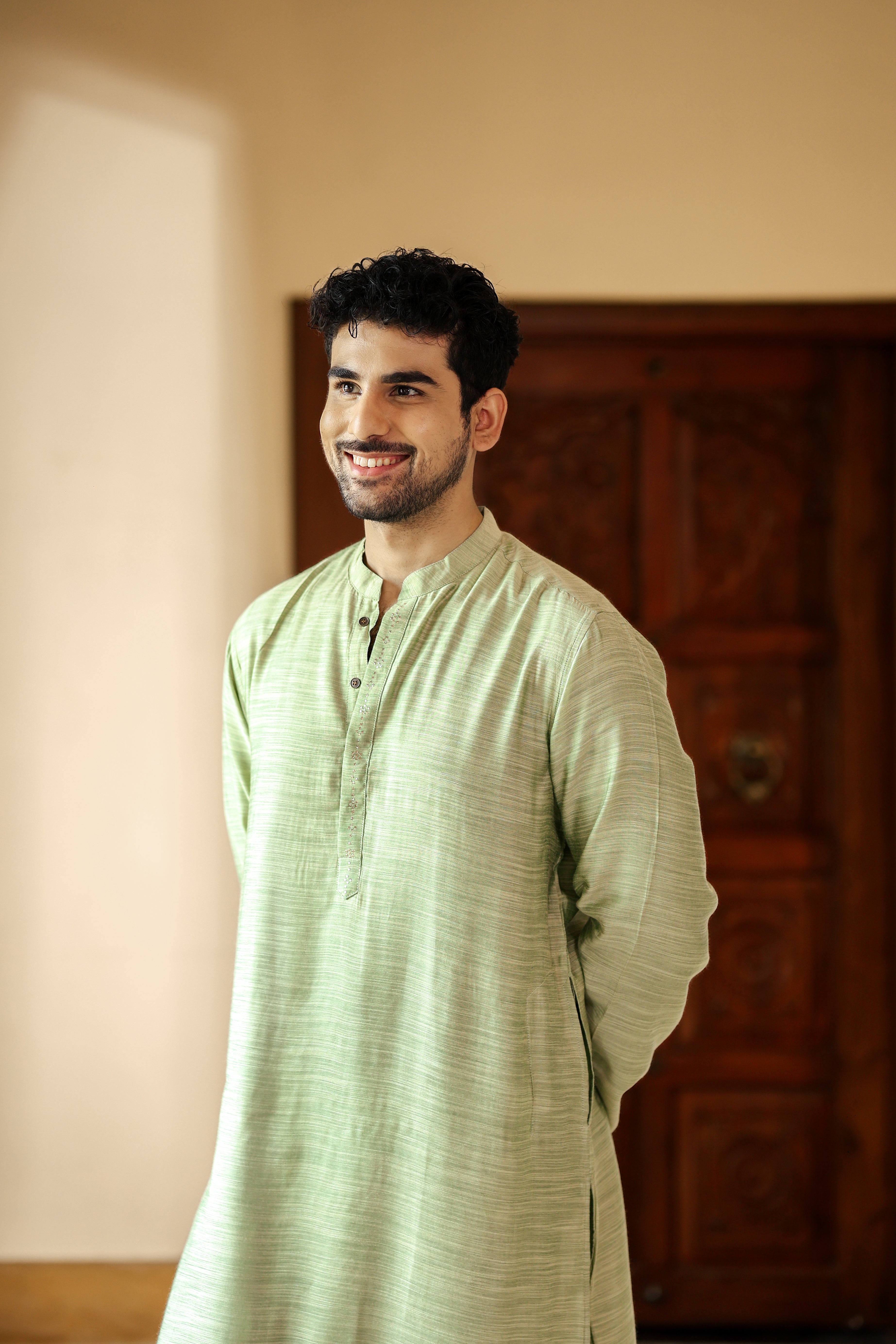 Woven in a soft silk-viscose slub, this pastel green kurta feels fresh, serene and quietly festive. Delicate mukaish work adds a subtle shimmer, catching light with every movement. A thoughtful pick for daytime gatherings and celebratory rituals.