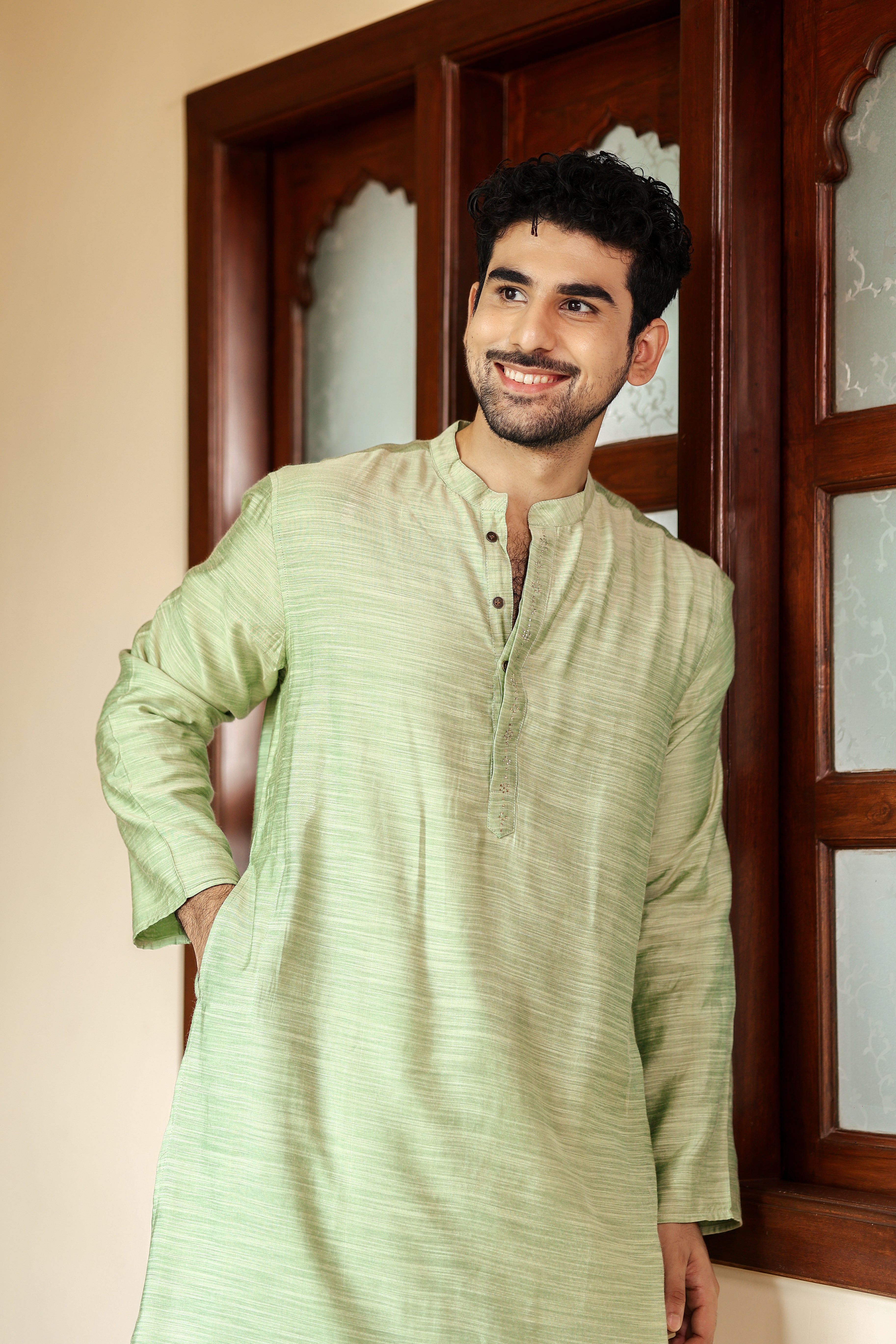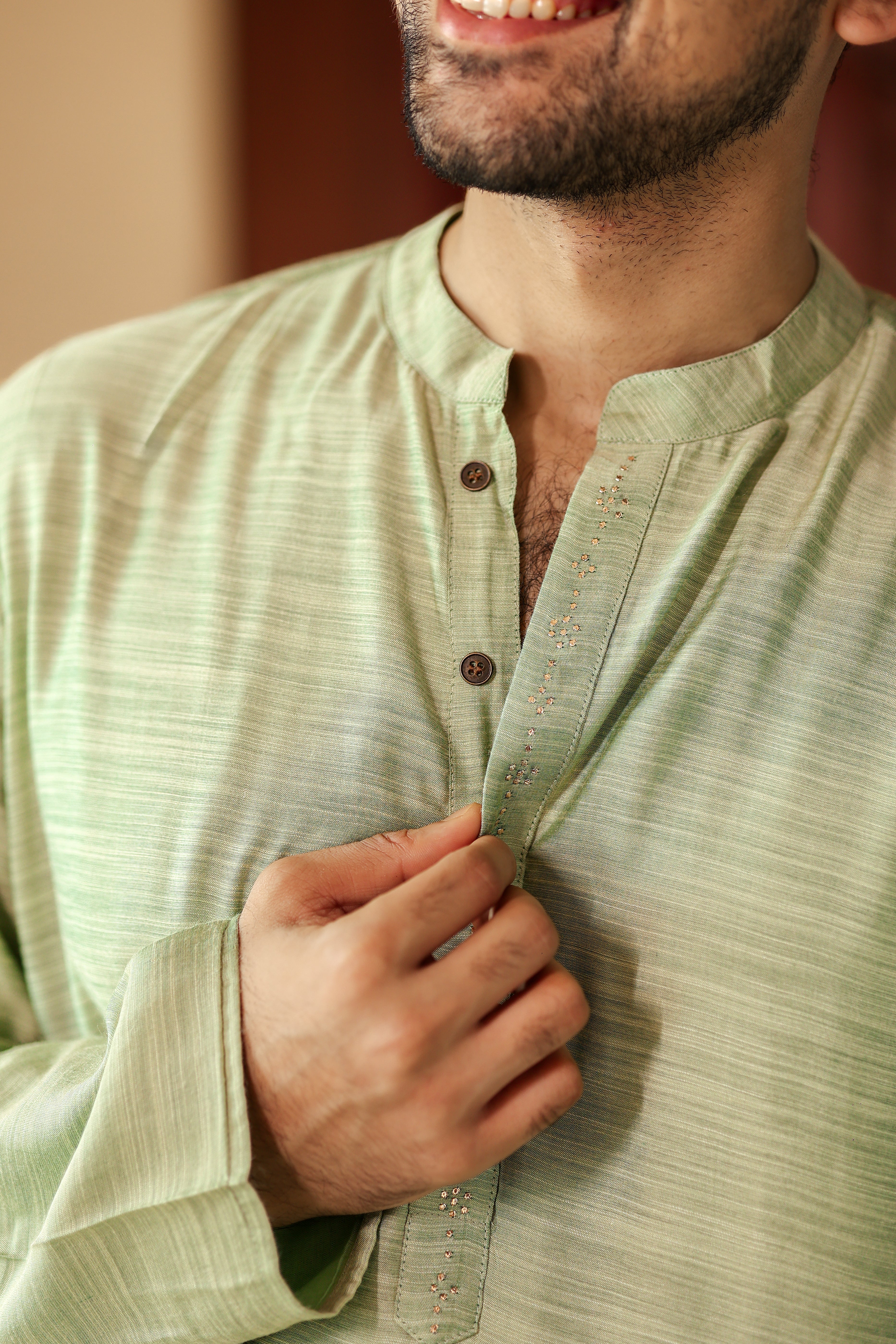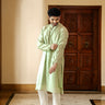 Pastel Green Mukaish Work Silk Viscose Slub Men Long Kurta MLKFS252C43