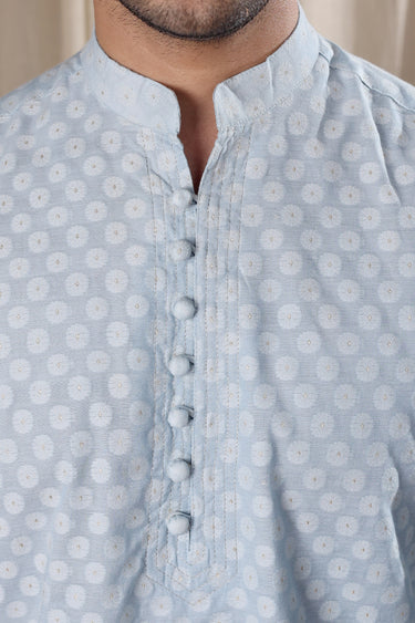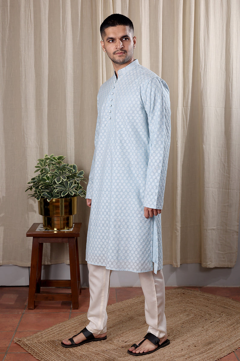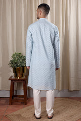 Powder Blue Jaquard Banarasi Art Silk Men Long Kurta Full Sleeves MLKFS251C19