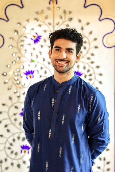 Woven in lustrous Banarasi silk, this kurta features jacquard buta motifs reimagined through the phases of the moon—an ode to quiet transformation. It offers a tailored fit and quiet sophistication. The perfect kurta for festive gatherings.