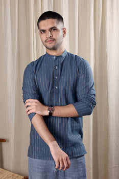 Denim Blue Zari Stripes South Cotton Men Short Kurta Full Sleeves MSKFS251C16