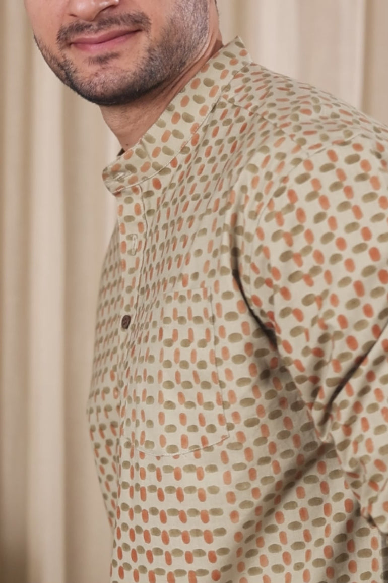 Beige Sanganeri Cotton Flax Men Short Kurta Full Sleeves MSKFS252C4