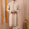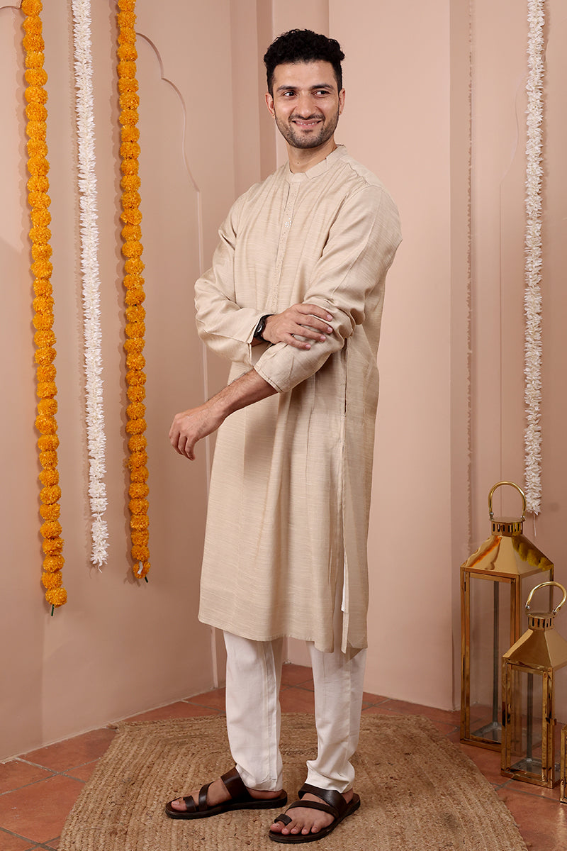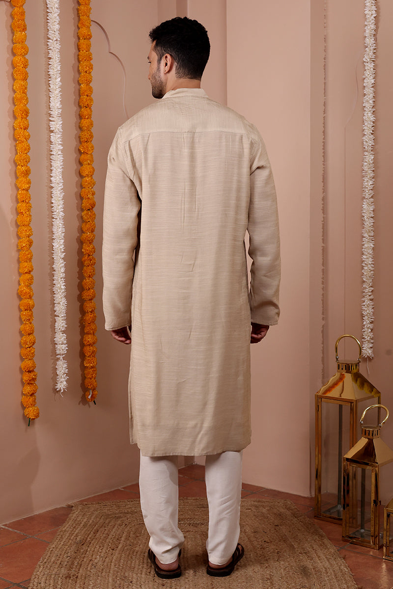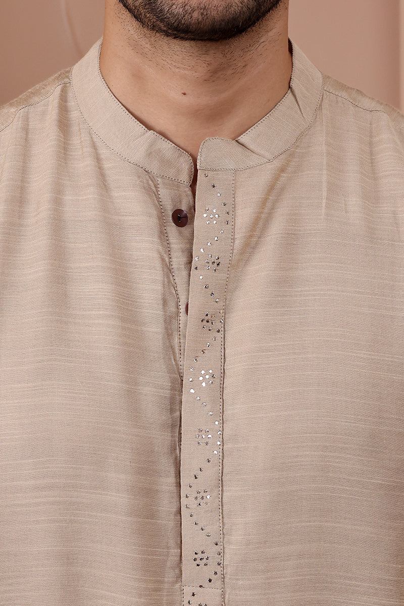 Beige Mukaish Work Silk Viscose Slub Men Long Kurta Full Sleeves MLKFS252C40