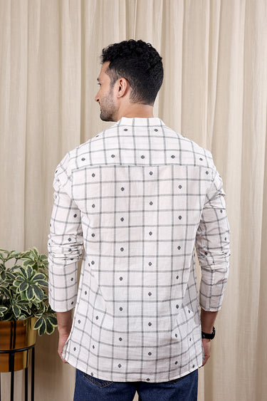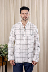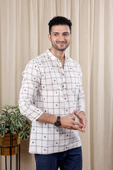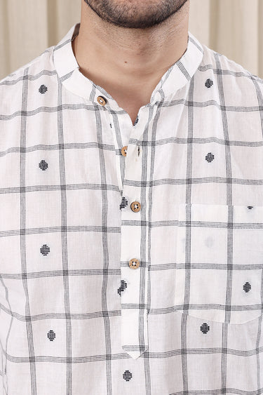 Off White Checks Buta South Cotton Men Short Kurta Full Sleeves MSKFS252C55
