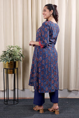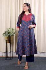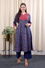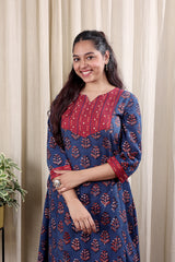 Indigo Hand Embroidery Dhabu Cotton Women Long Kurta Long Sleeves WLKLS252C94