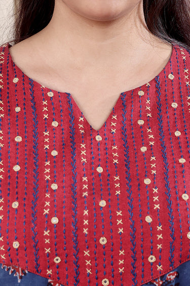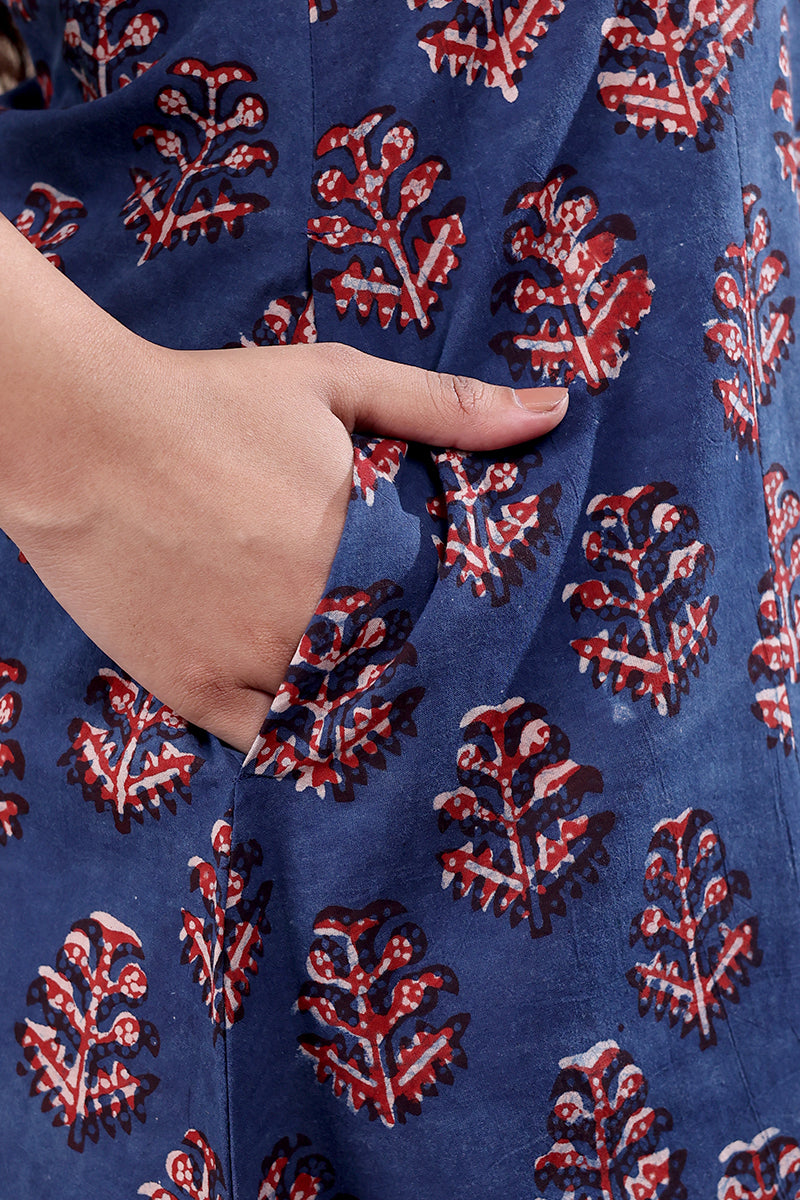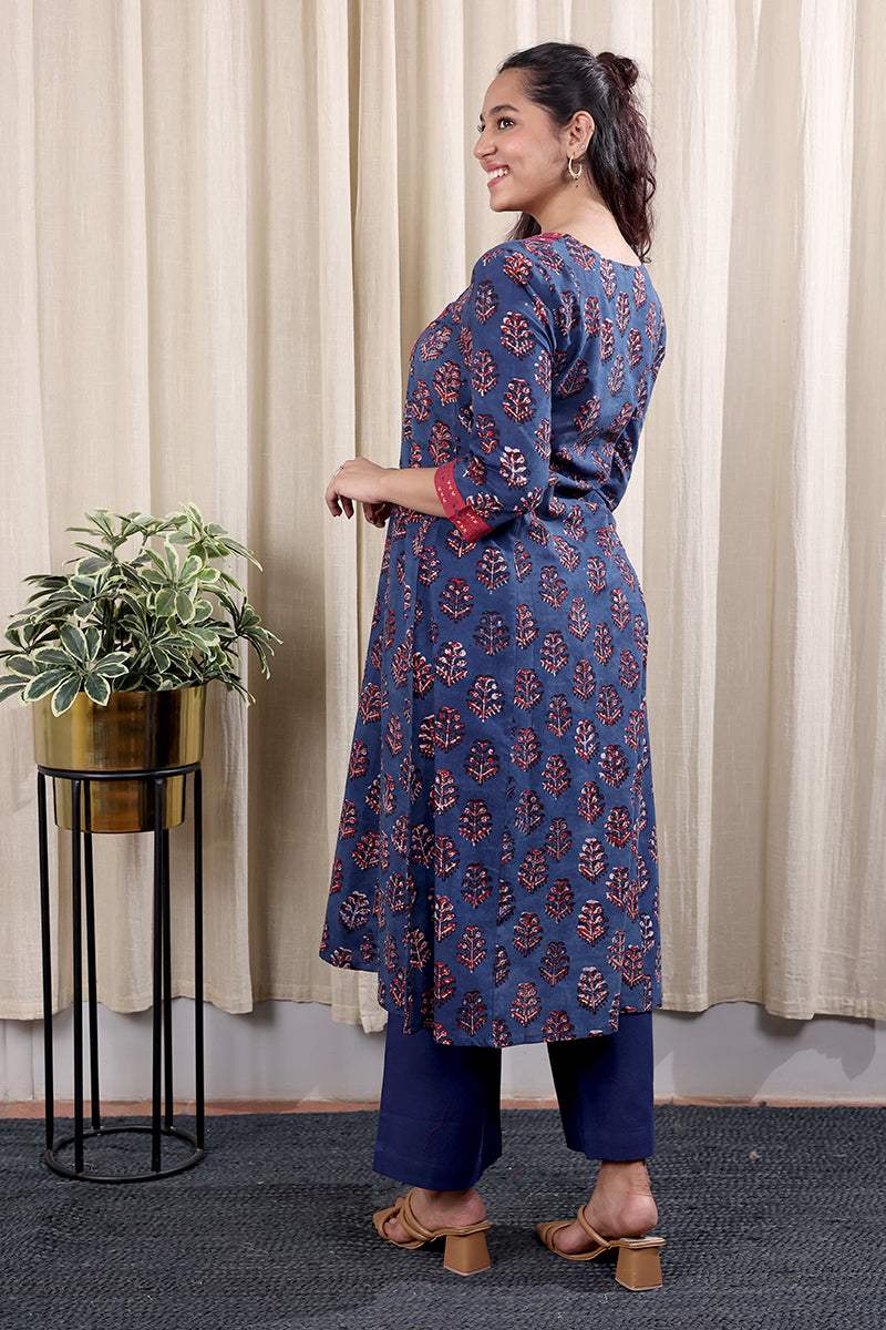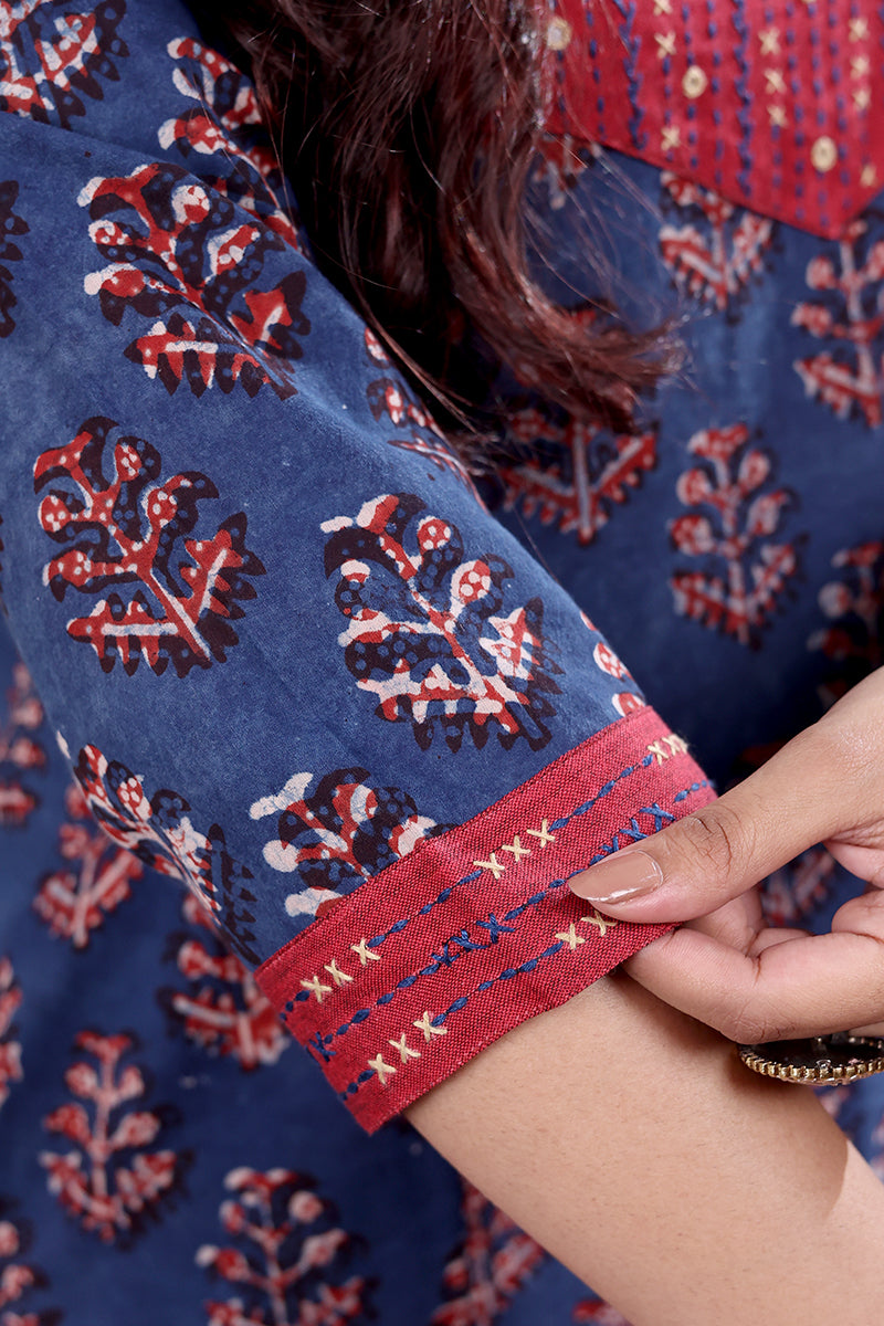 This kurta features handblock print, hand embroidery detailing and a side pocket on the right. To complete your look, pair it with our matching bottom.