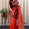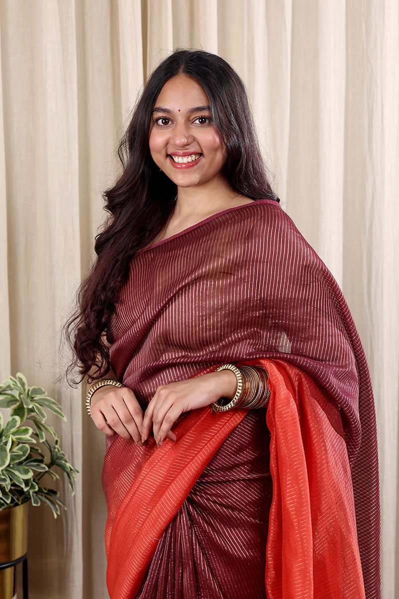 A vibrant ombré saree enhanced with subtle shimmering zari stripes for a refined and elegant ethnic look. Comes with a blouse piece.
