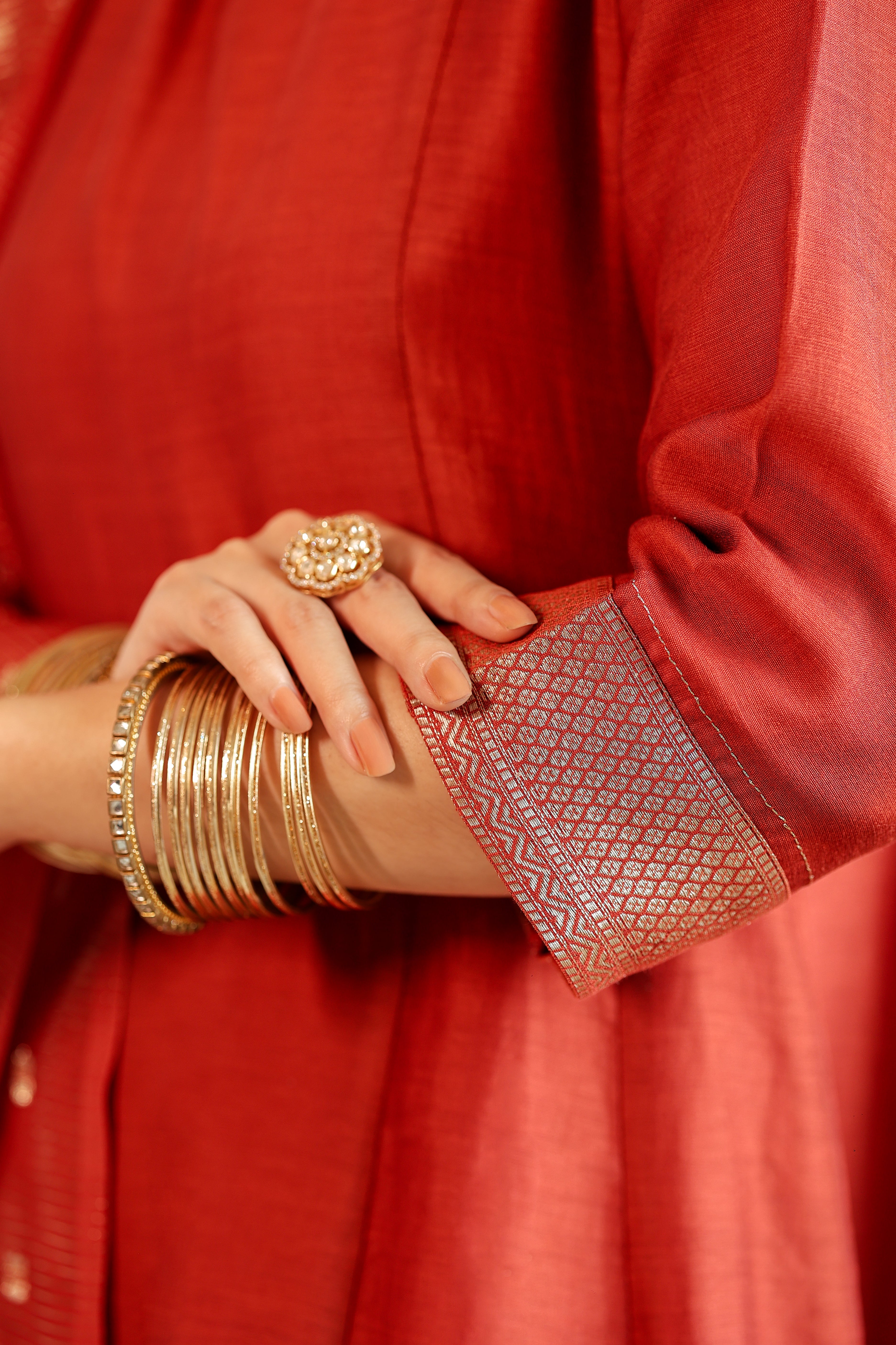 Set in a refreshing rust hue, this Banarasi kurta features an intricate Jaquard border. Tailored in a-line silhouette with a soft cotton lining. Pair it with our matching bottom and dupatta to complete the look.