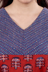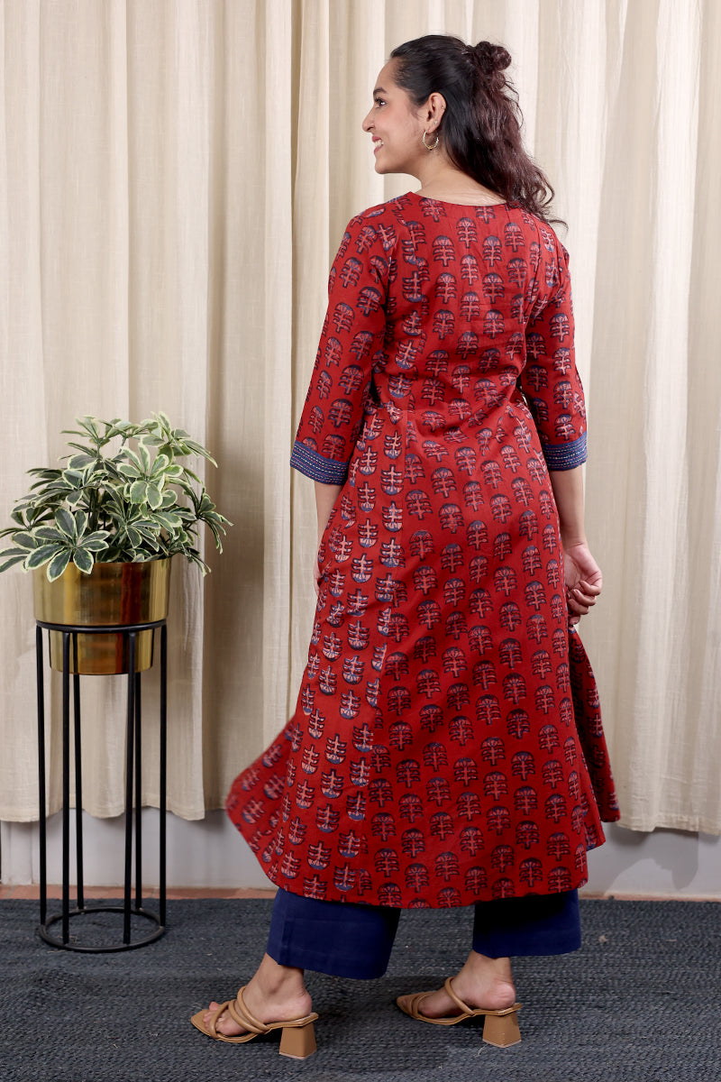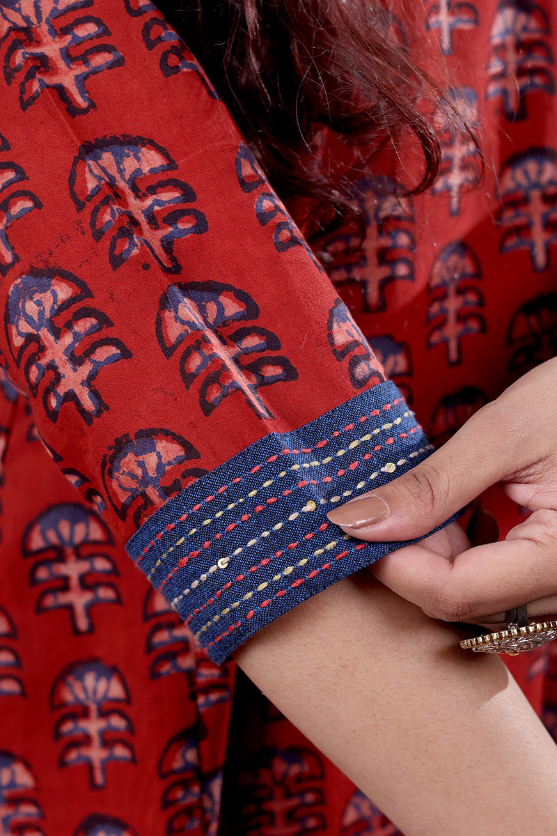 This ankle-length kurta features handblock prints and hand embroidery detail for an elevated touch.