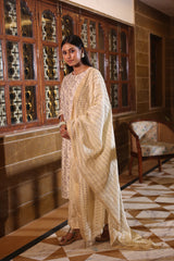 Beige Chanderi silk enhanced with delicate Sanganeri patterns lends a touch of quiet elegance to this kurta. Cut in a flowing long silhouette with full sleeves and a lightweight lining for added ease. Pair with our coordinated bottom and dupatta for a graceful finish.
