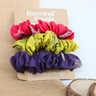 A vibrant set of 3 printed silk scrunchies, each featuring unique patterns to instantly elevate your look. Perfect for adding a fun, playful touch to any outfit.