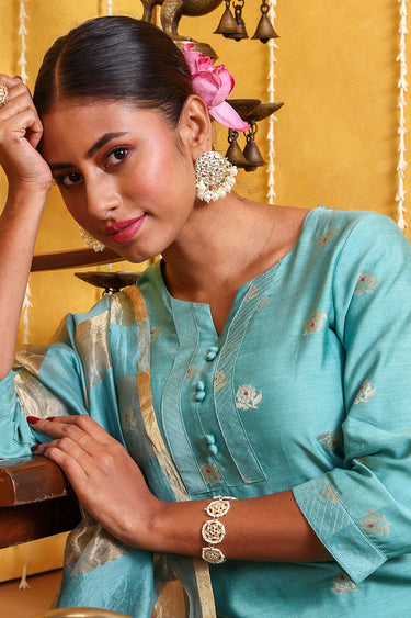 Teal Blue Jaquard Buta Banarasi Silk Women Long Kurta Long Sleeves WLKLS252C141