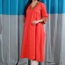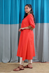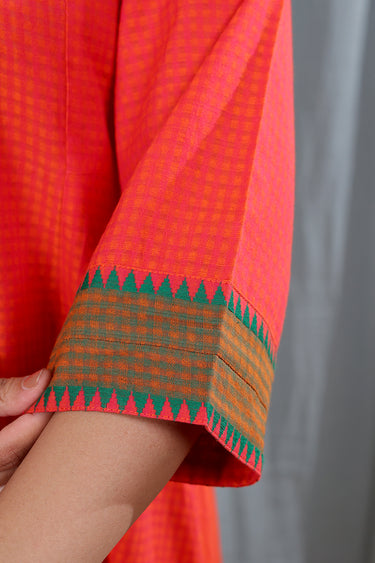 A coral red long kurta in south cotton with traditional temple border detailing. Long sleeves and a relaxed fit make it a comfortable, go-to choice for everyday ethnic wear.