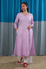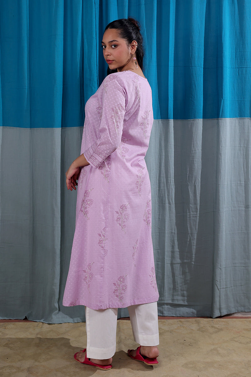 A soft lilac long kurta in cotton dobby with Sanganeri handblock printed motifs and a comfortable, relaxed fit. Long sleeves and a breathable fabric make it a lovely pick for warm, easy days.