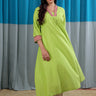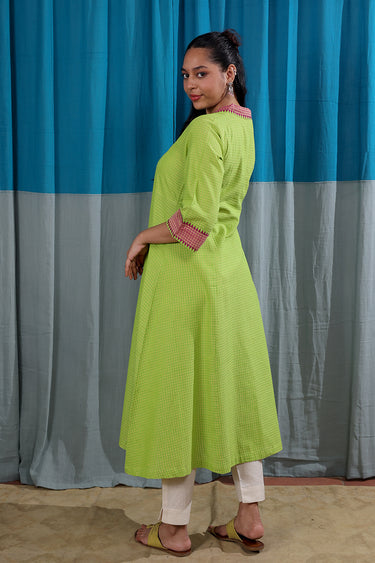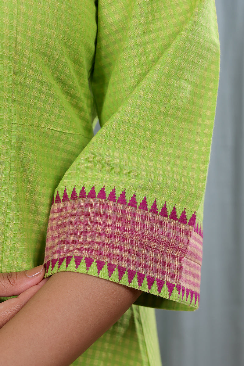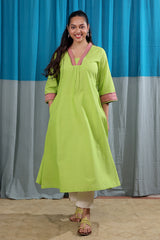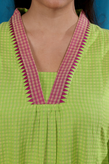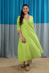 A lime green long kurta in south cotton with a traditional temple border that adds a grounded, ethnic touch. Comfortable, long-sleeved, and easy to wear through the day.