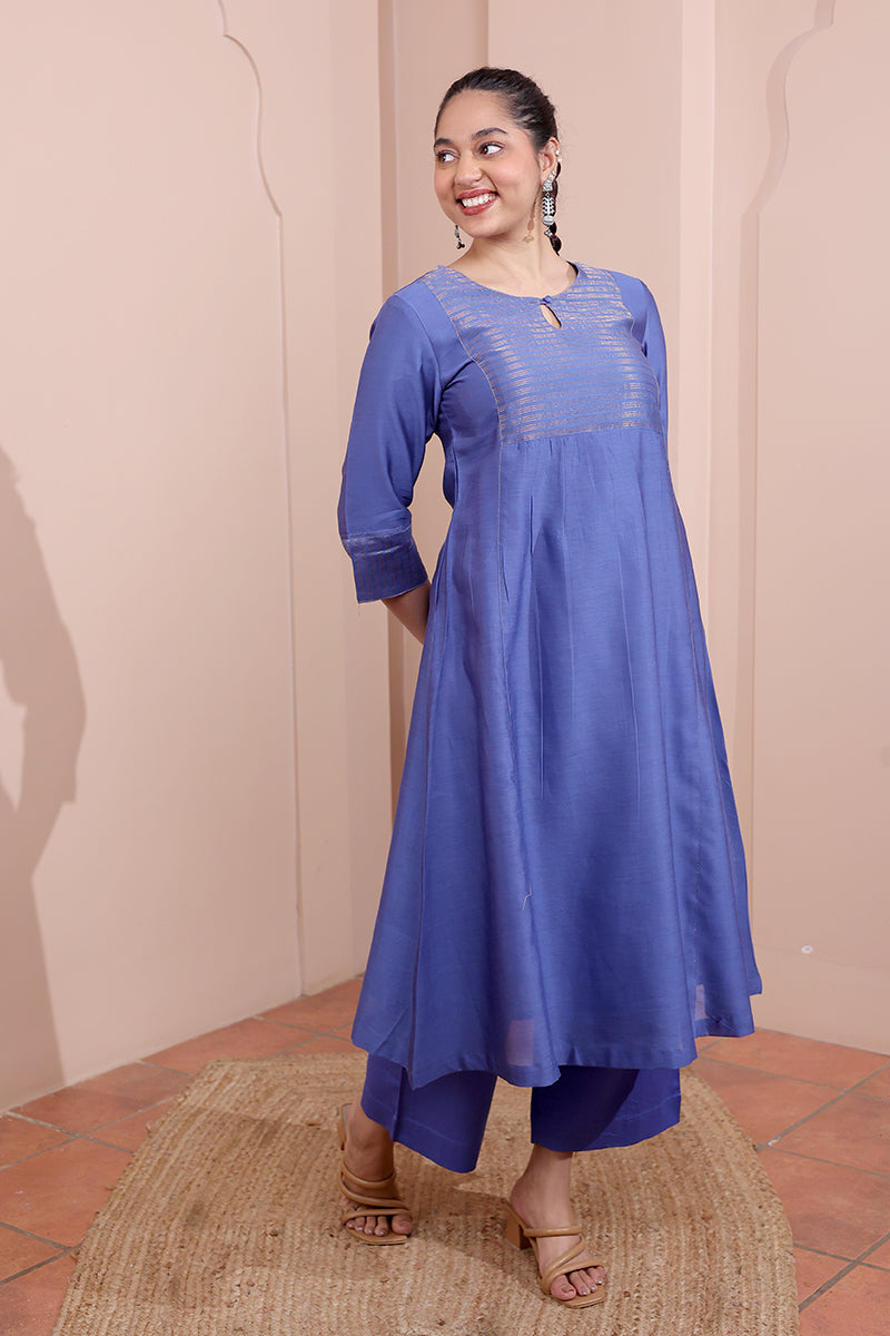 This hand dyed Chanderi silk kurta features zari stripe detailing on the sleeves and yoke, along with a side pocket on the right. Pair it with our coordinating bottom for a look that’s effortlessly put-together.