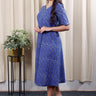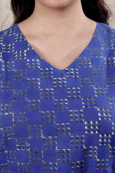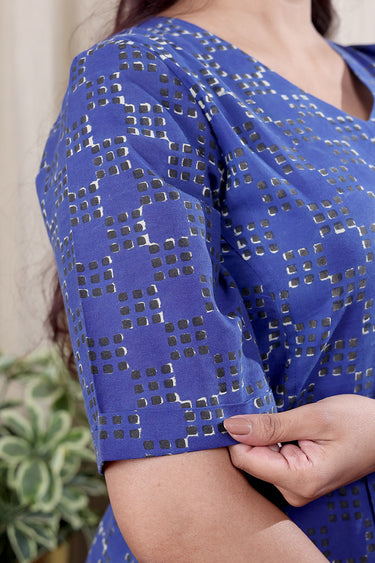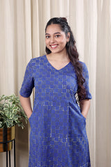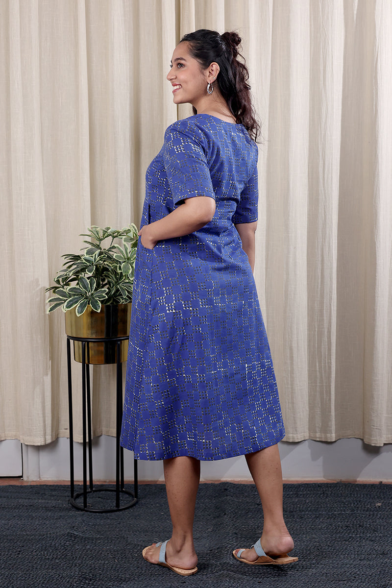 Dark Blue Bagru Cotton Women Midi Dress Long Sleeves WDRLS252C26