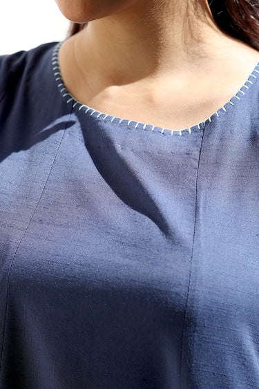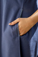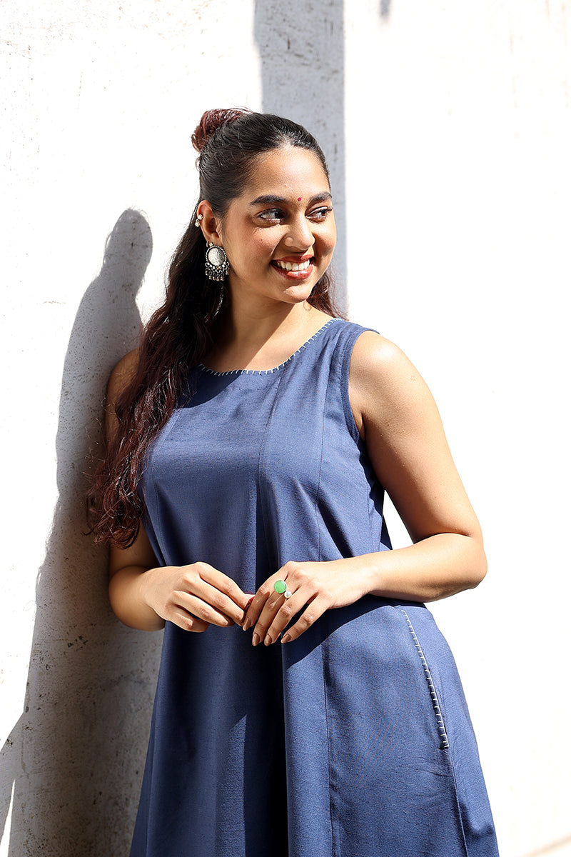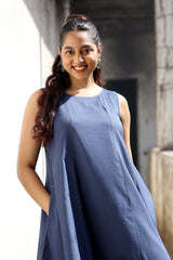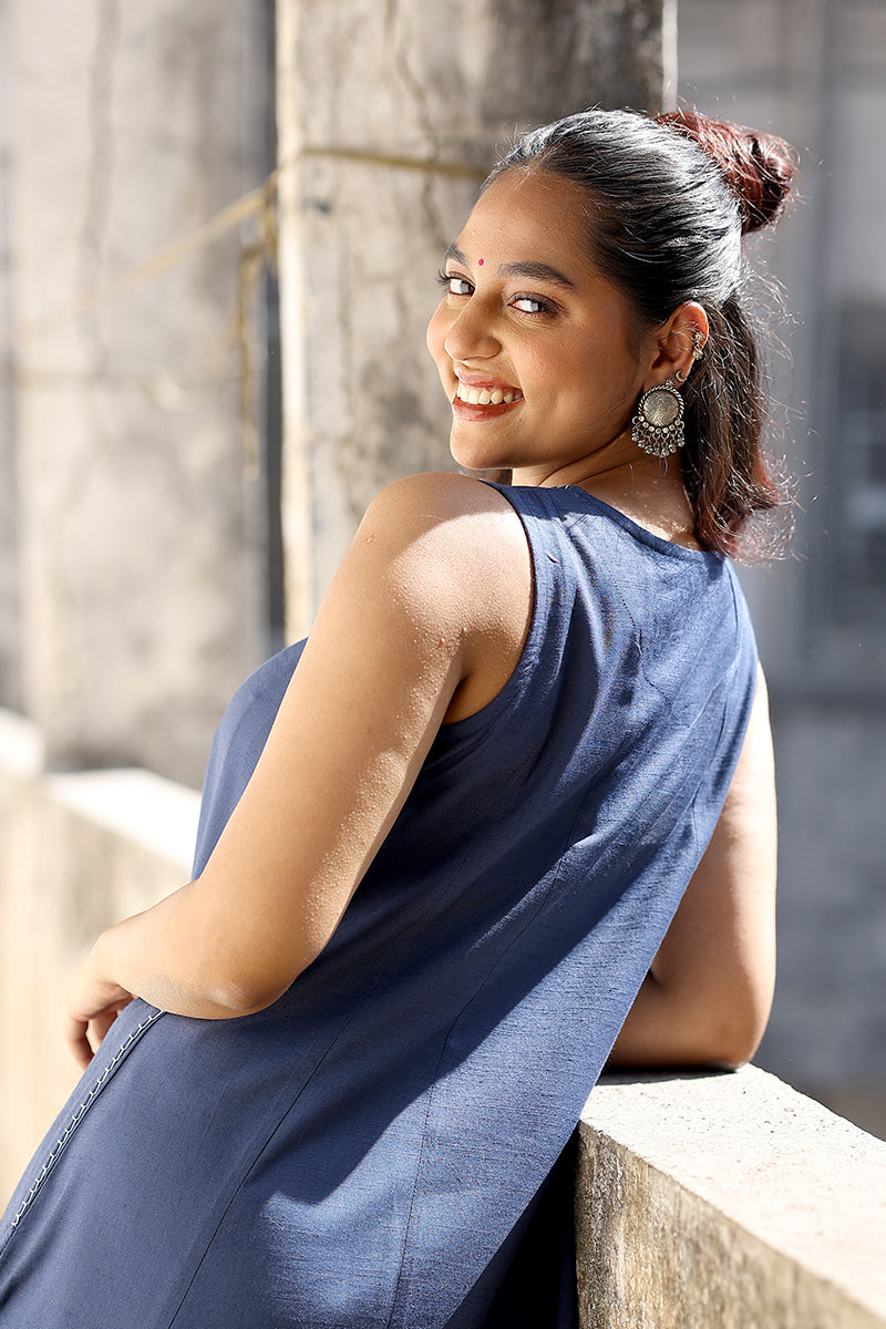 Navy Blue Hand Dyed Cotton Viscose Blend Women Midi Dress Sleeveless WDRSL253C7