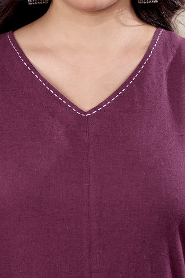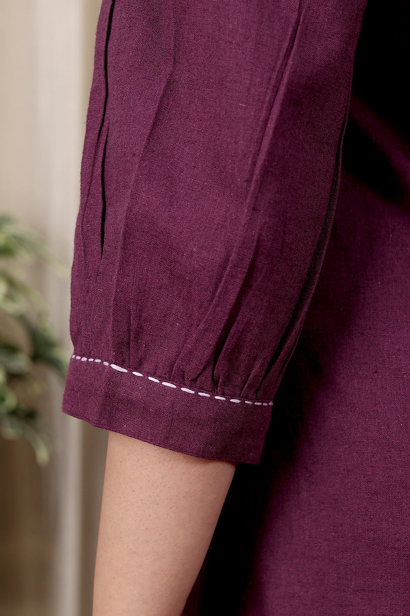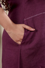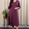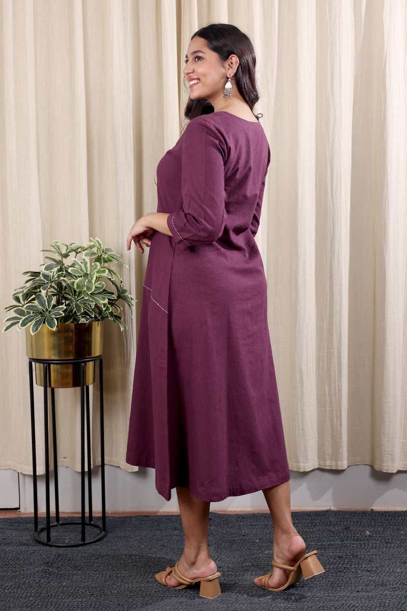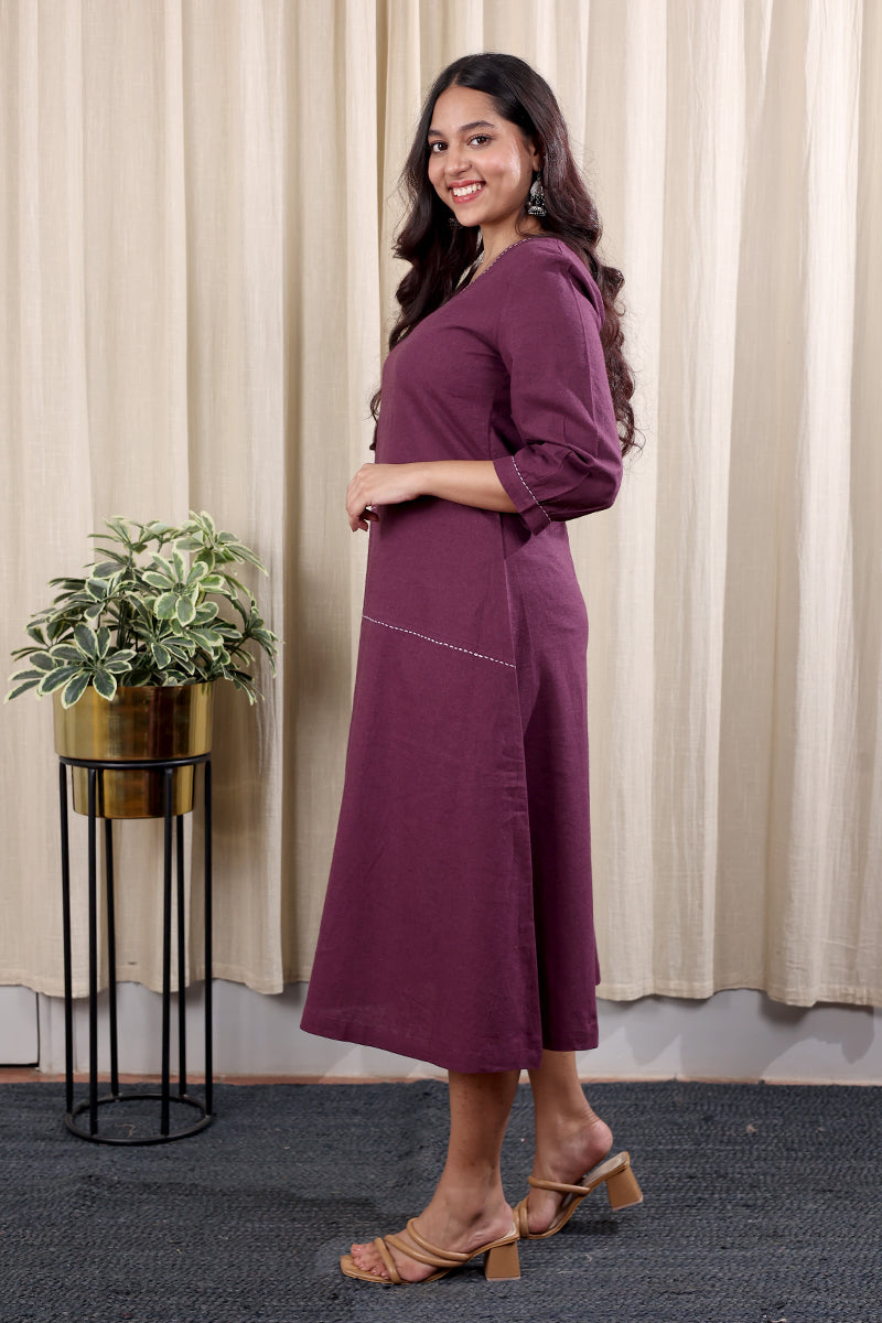 Purple Prune Hand Dyed Cotton Linen Women Midi Dress Long Sleeves WDRLS252C19