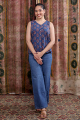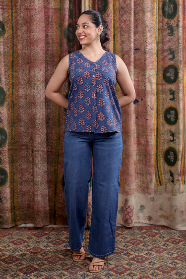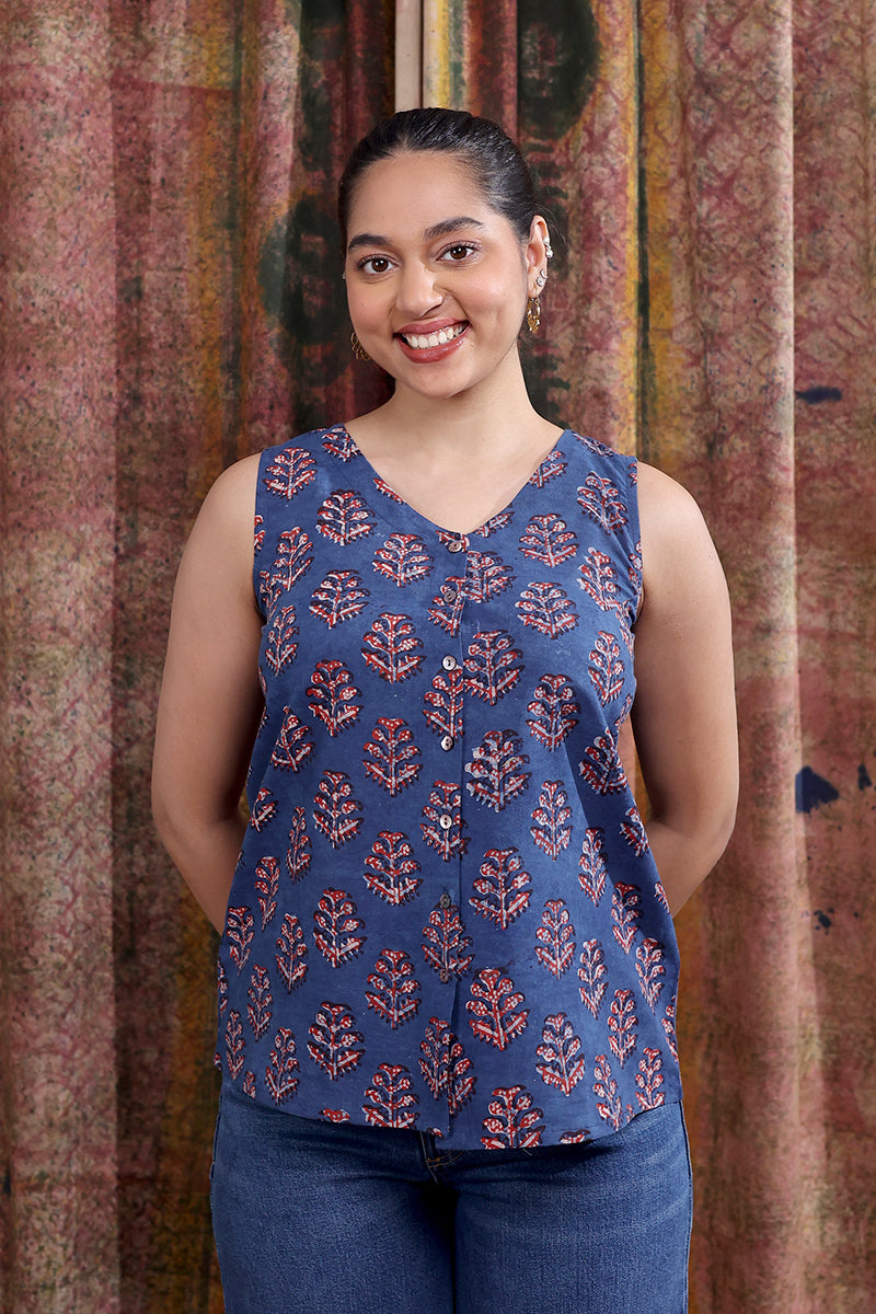 Crafted in cotton, this sleeveless Dhabu handblock print top offers easy layering and everyday comfort. A go-to piece that pairs effortlessly with skirts, pants or denims.