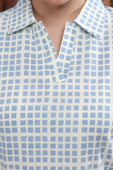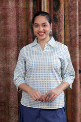 This short top features a subtle all-over geometric handblock print, featuring a collared neckline and three-quarter sleeves. Perfect to pair-up with high-waist denims, trousers or our wraparound skirts for an effortless everyday look.