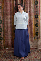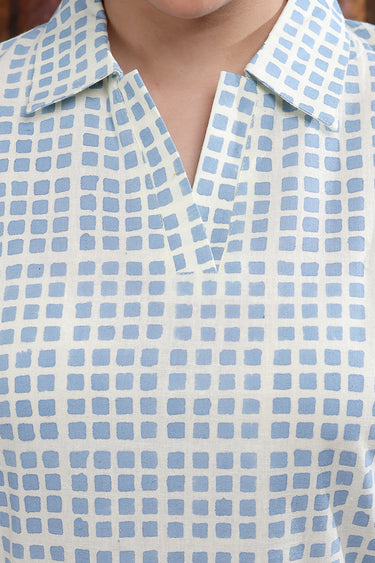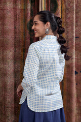 Teal Blue Sanganeri Cotton Linen Women Short Top Long Sleeves WSTLS253C5