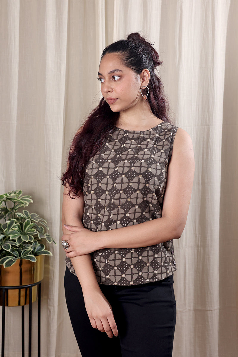 Crafted in Dhabu, this sleeveless top offers easy layering and everyday comfort. A go-to piece that pairs effortlessly with skirts, pants or denims.