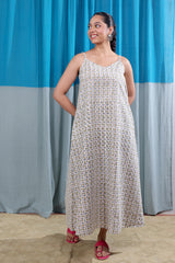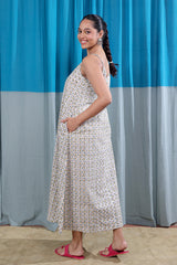 A beige grey sleeveless maxi dress in lightweight cotton flax, featuring Sanganeri handblock printed motifs and two front pockets. Airy and comfortable — a go-to for long, warm days.