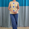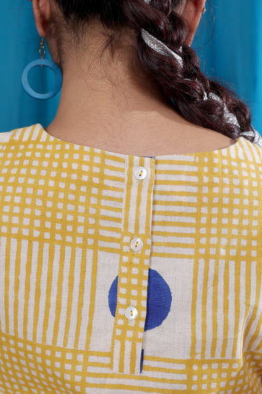 A bright yellow sleeveless short top in natural cotton linen with Sanganeri handblock printed motifs. Cheerful in colour and light on the body — made for sunny days.