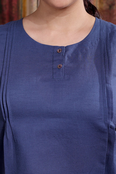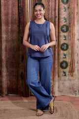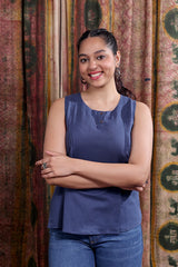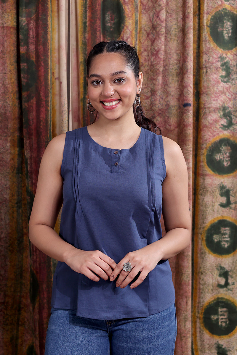 Navy Blue Hand Dyed Cotton Linen Women Short Top Sleeveless WSTSL253C6