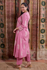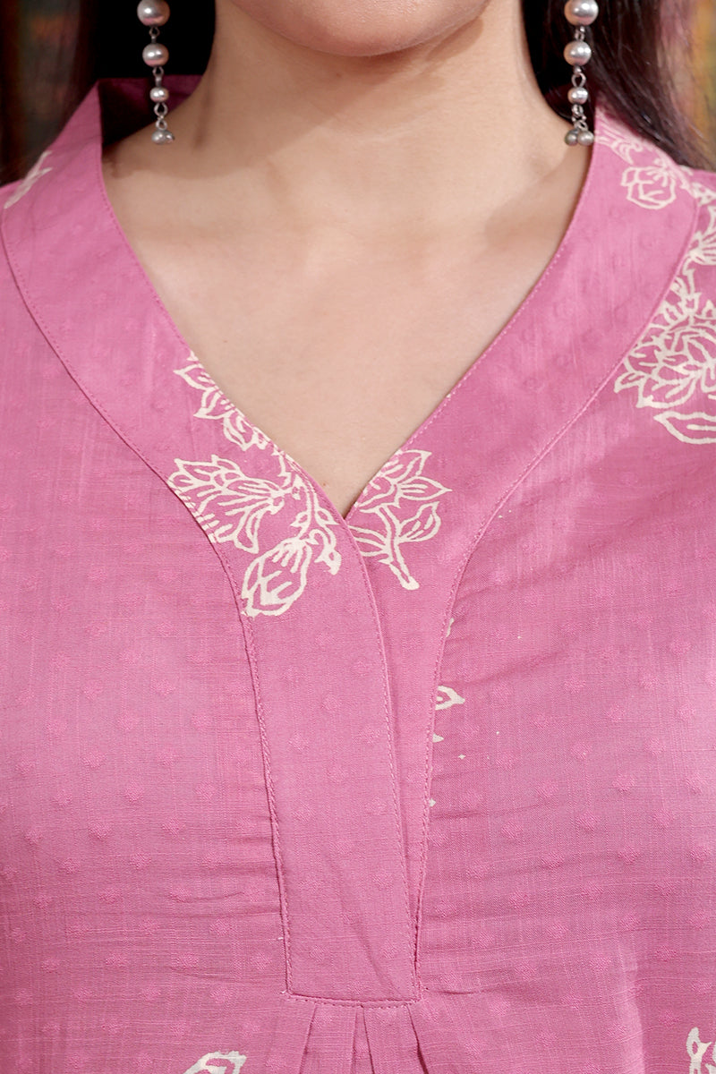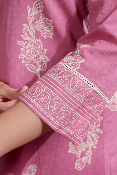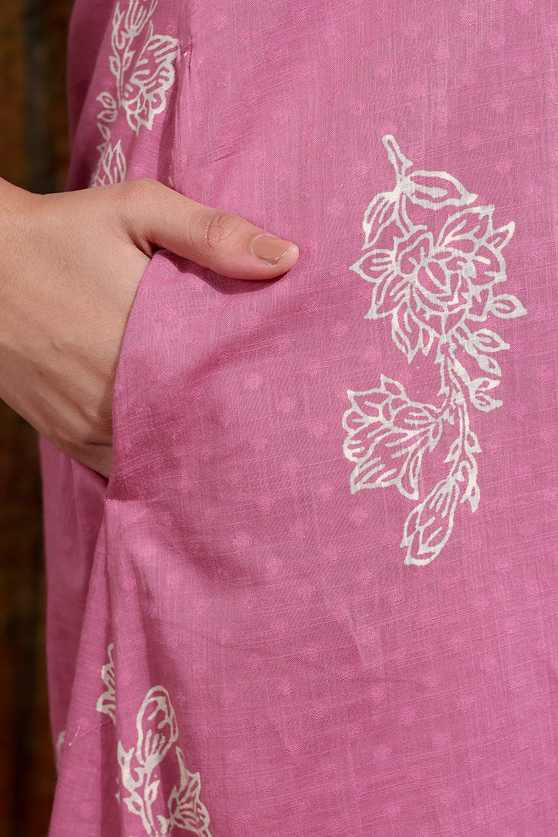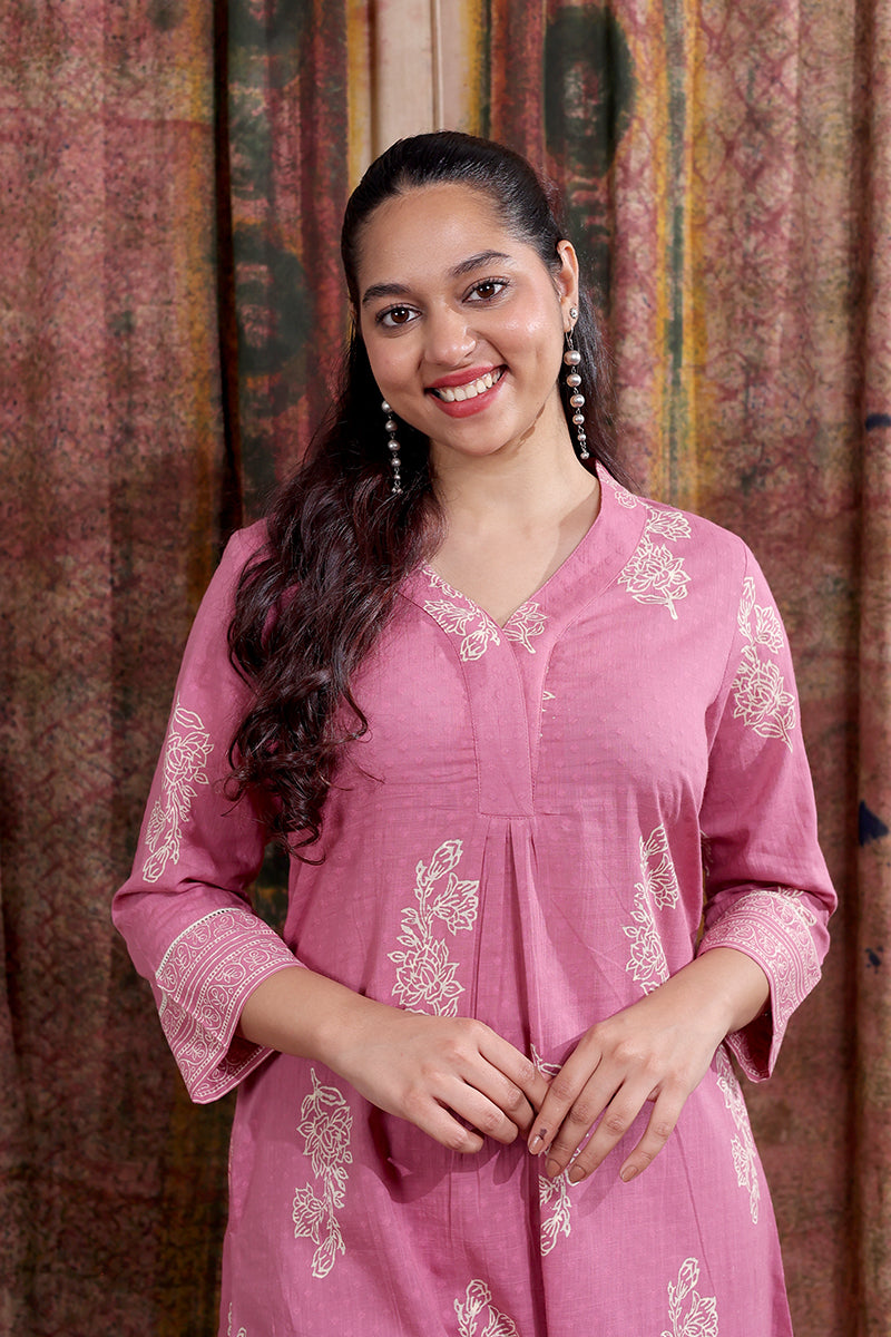 This soft, breathable cotton dobby kurta features a Sanganeri handblock print, lace detailing on the sleeves and a side pocket on the right for added comfort. Pair it with our matching bottom for a look that’s effortlessly put-together.